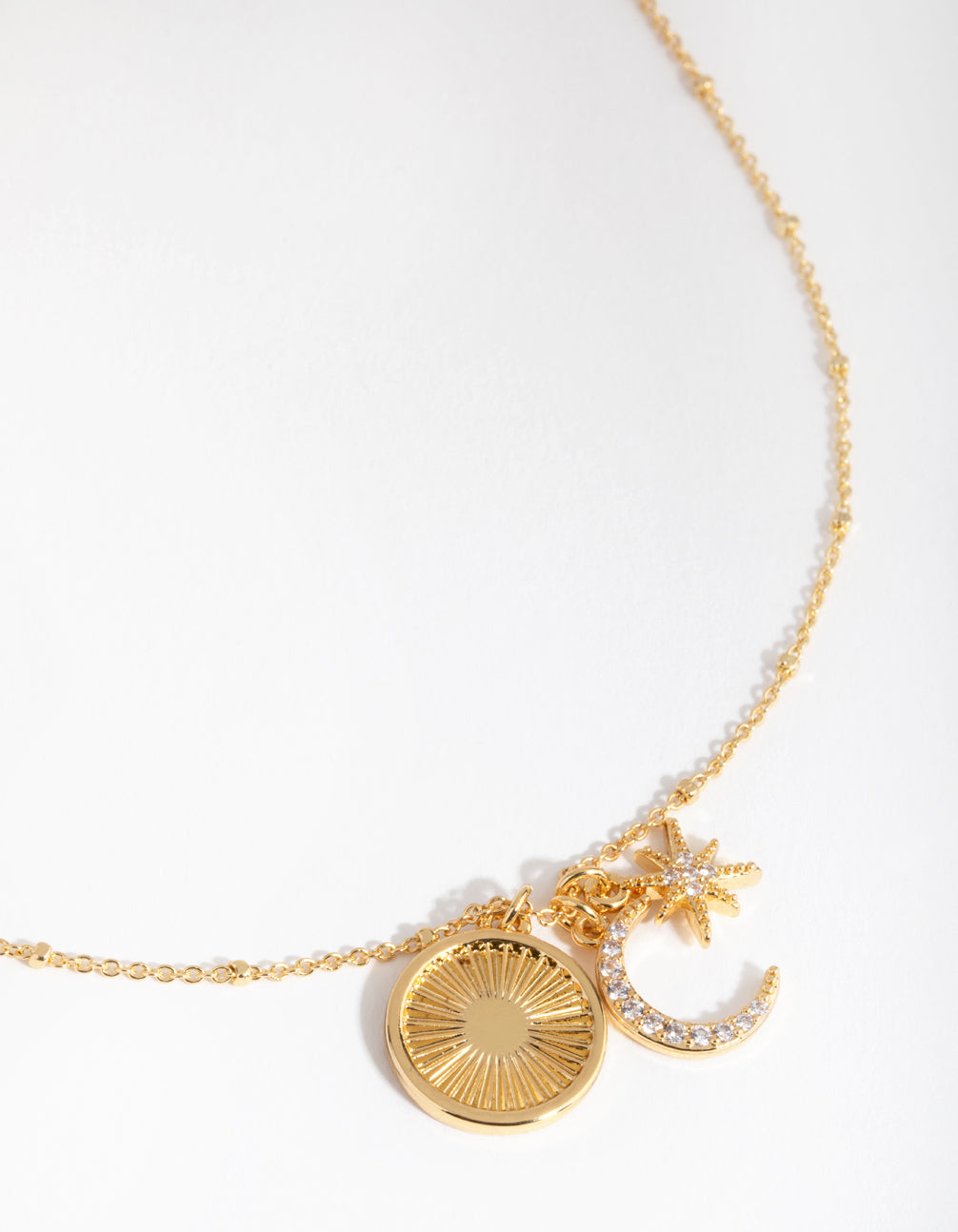 Celestial, talisman and tarot-inspired pieces: a collection of vintage-inspired jewellery designed to be kept and treasured. This lovely necklace is plated with genuine 18ct gold for authentic lustre and shine. It features a disc-like pendant etched with a sun design, as well as star and moon charms studded with cubic zirconia. Beautiful and dainty, this ethereal piece evokes an otherworldly charm.