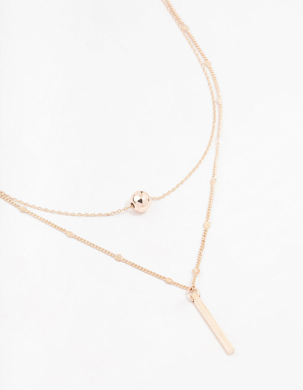 Embrace the art of layering and let this necklace be the centerpiece of your look, elevating your everyday style to new heights. This necklace features a rose gold base and bar and ball motifs for a boho but trendy finish.