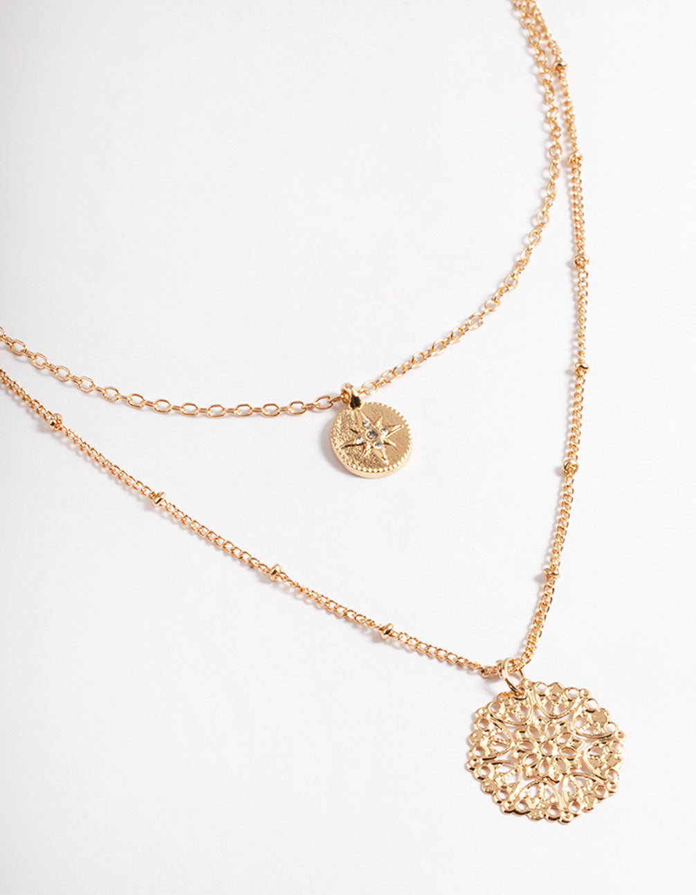 Embody the latest texture trend, hot off the runway! Our gold-toned filigree row necklace is a timeless and trending accessory to complement your collection. Style yours with some adorning filigree drop earrings and a slicked back hairstyle!
