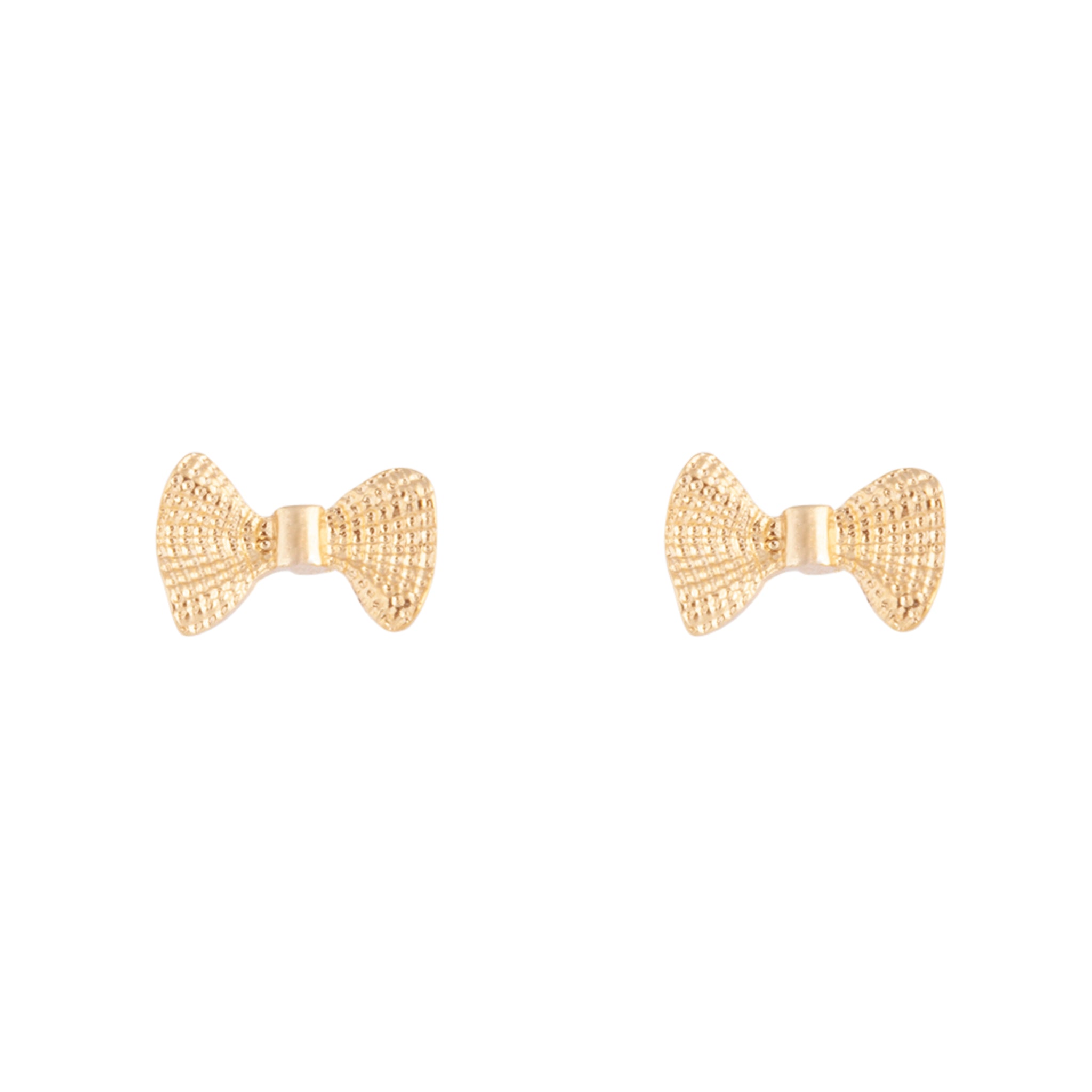 A pair of gold-toned metal stud earrings in a bow design.