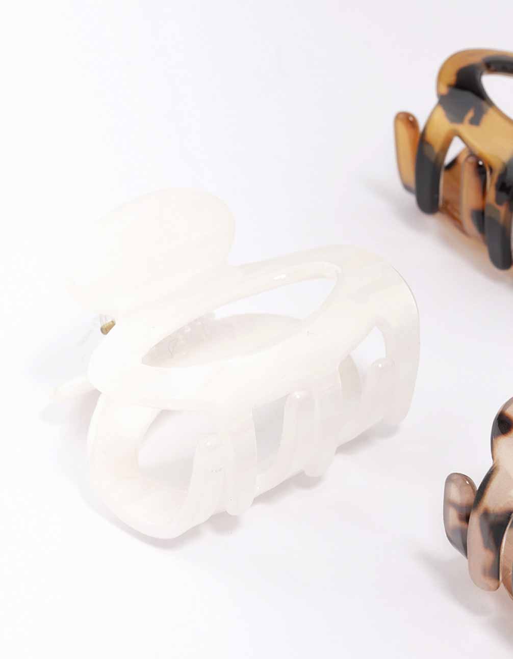 This pack contains three tortoiseshell claw clips in a cream, brown and pink colourway.