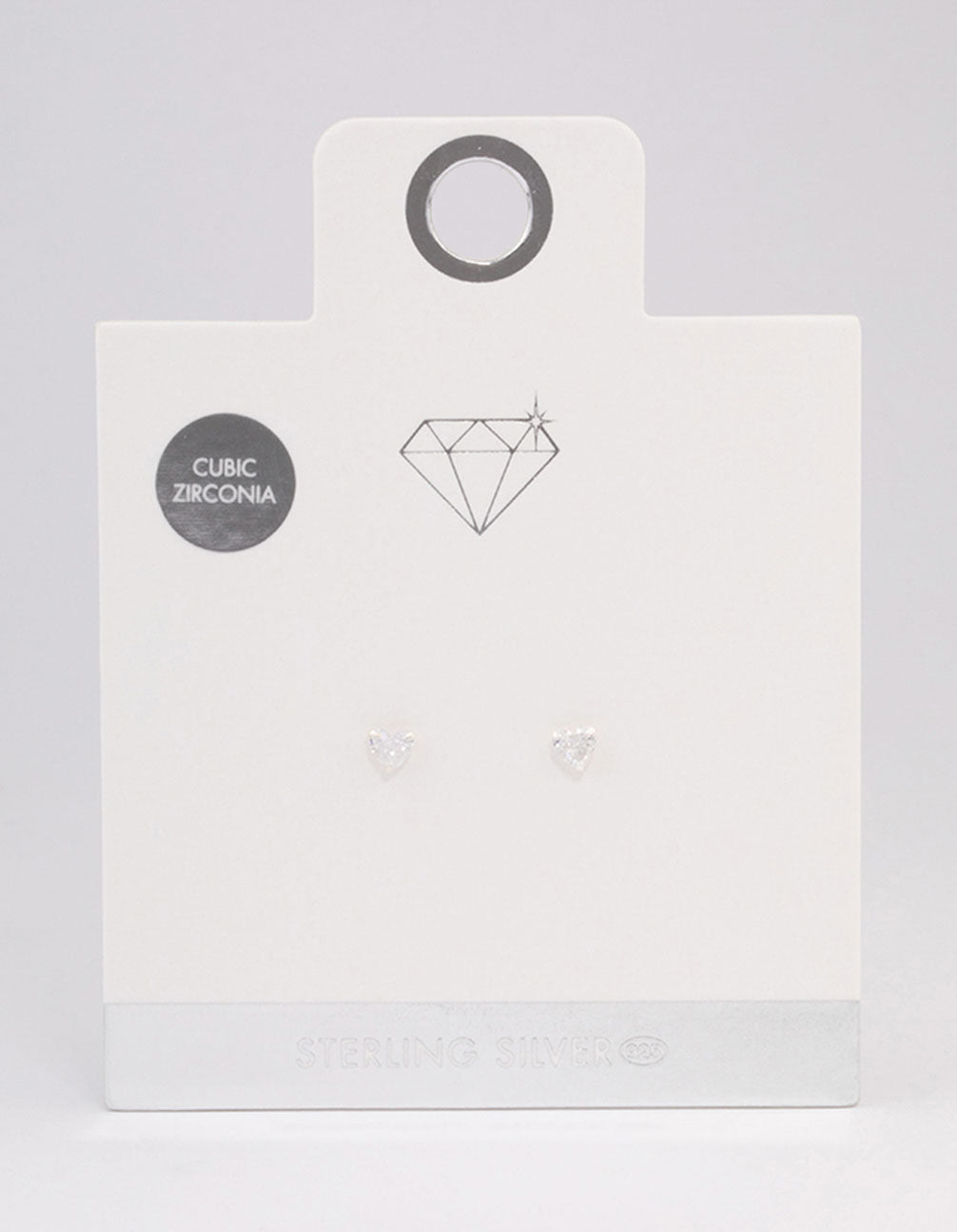 - This set of staple sterling silver stud earrings features cubic zirconia crystals in the shape of a heart for a lovable look.