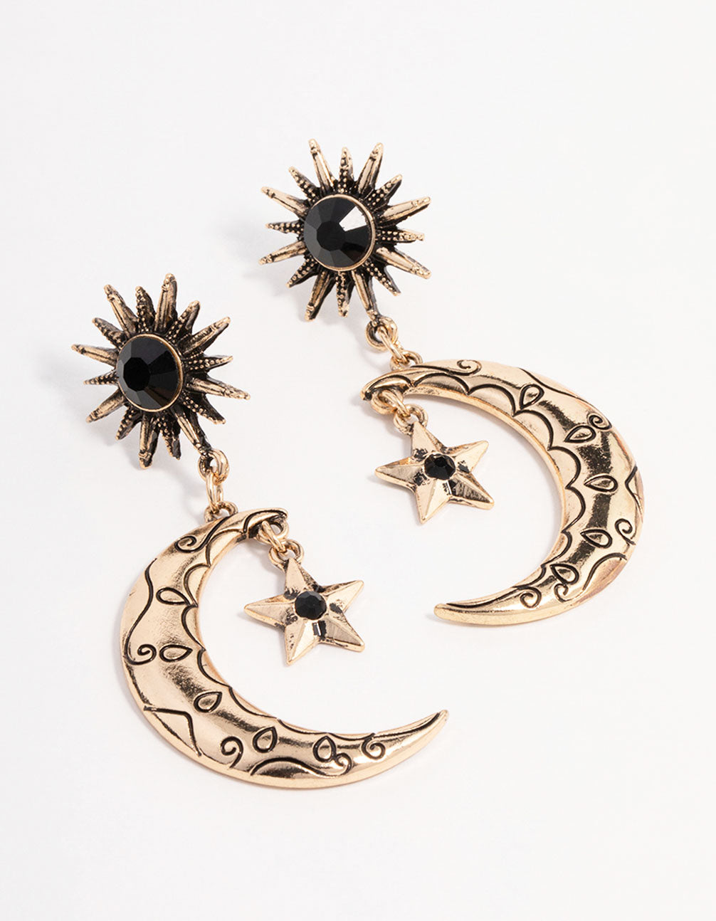 For a captivating finish to your outfit, style these antique gold drop earrings. These lovely statement earrings feature a celestial moon design, adorned with black accents for a touch of drama.