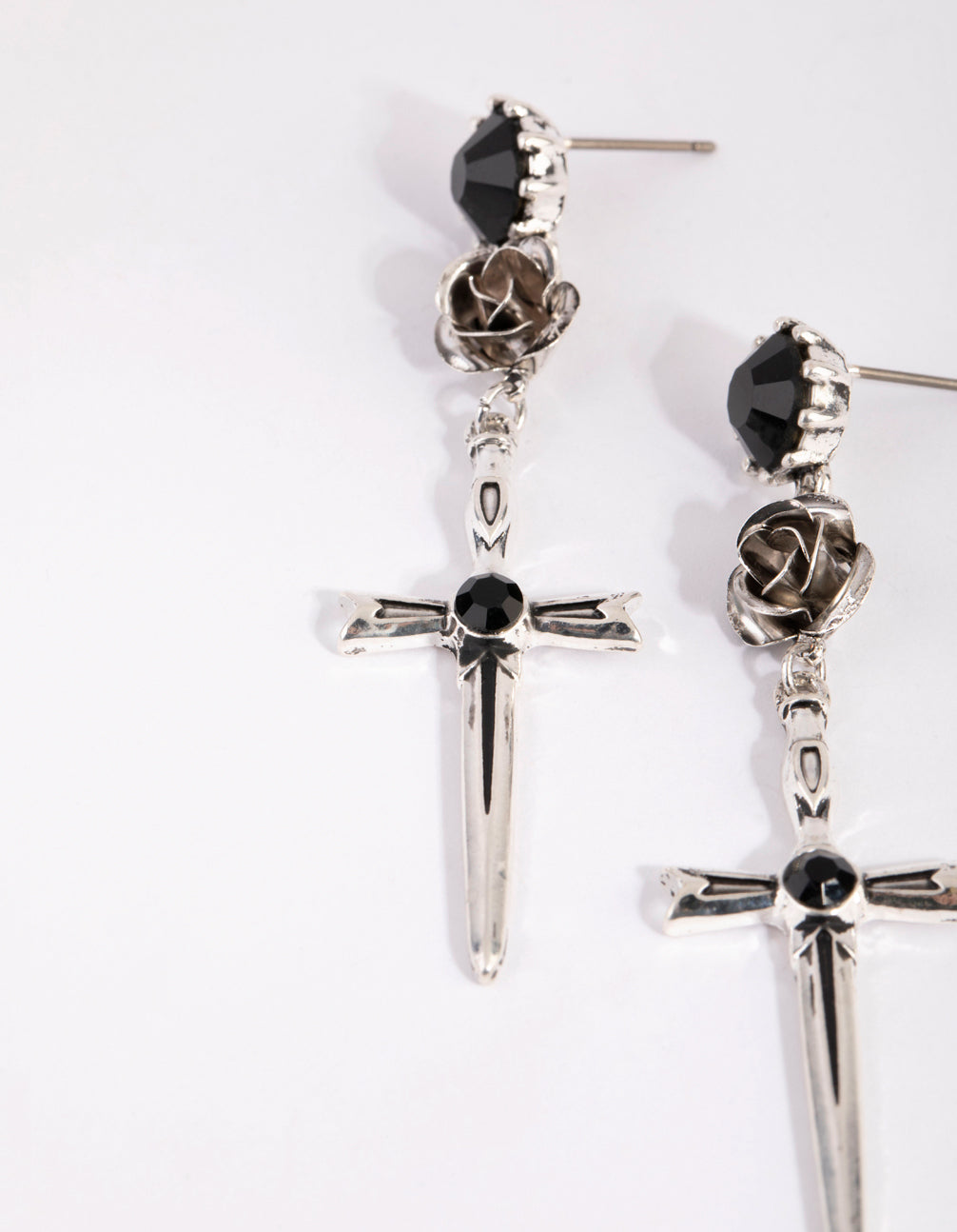 These silver-toned earrings have an antqiue finish that lends them a vintage vibe! They boast a sword-like design with rose details. Wear them with black for a dramatic look!