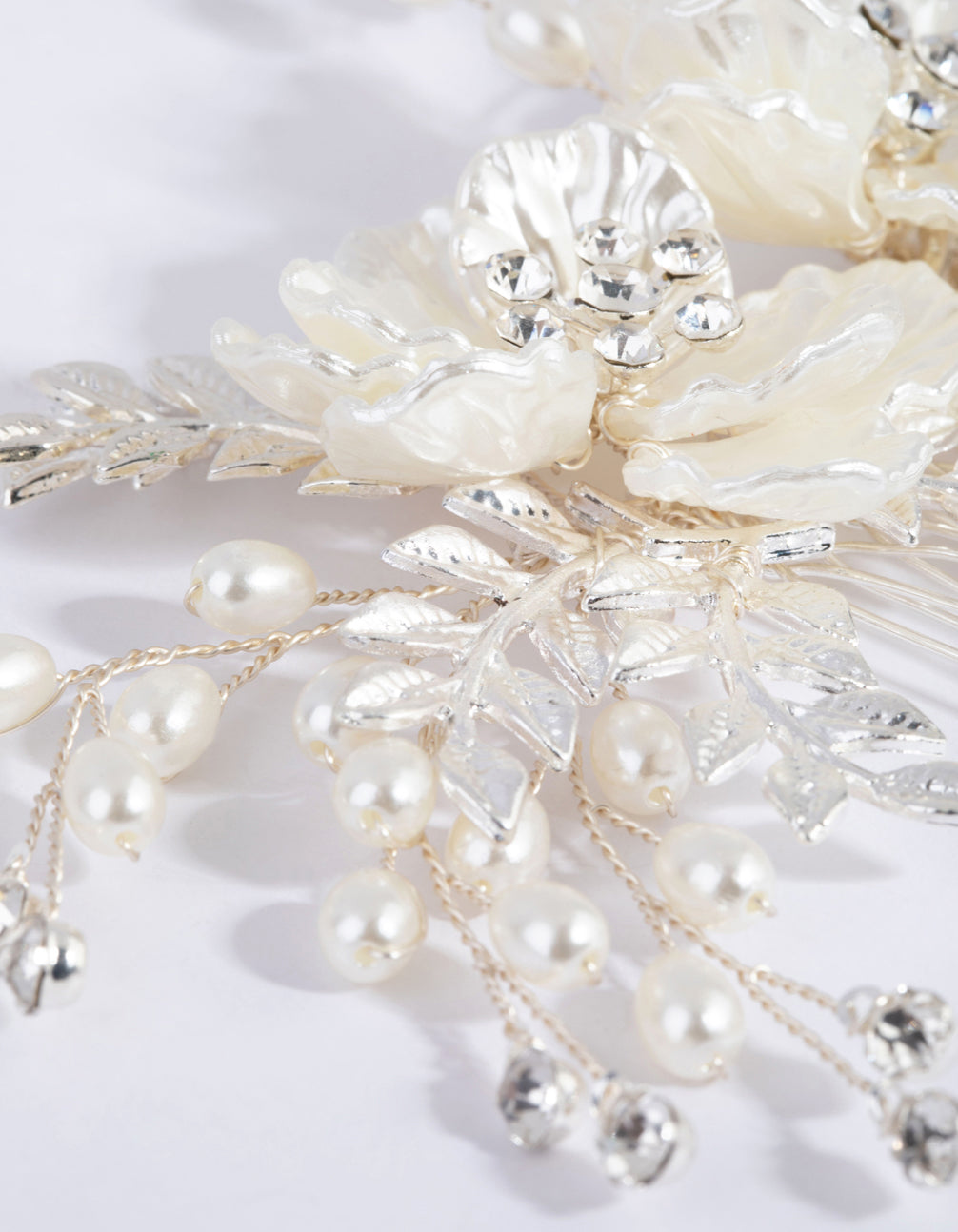 This lovely flower comb is perfect for a formal finishing touch! It's silver toned, and features an intricate floral design with pearl details. Simply stunning!
