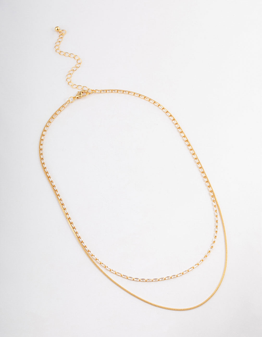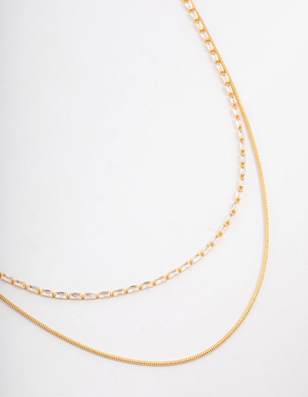 - Pair this Gold Plated Cubic Zirconia Dainty Baguette Layered Necklace with a pair of timeless gold hoops for a signature look.