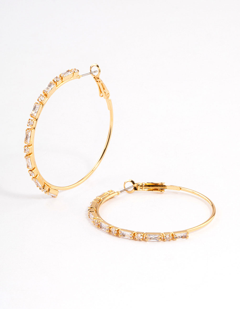 - Pair these Gold Plated Round & Baguette Large Hoop Earrings with a simple pendant necklace from our Boutique Collection for a signature look.