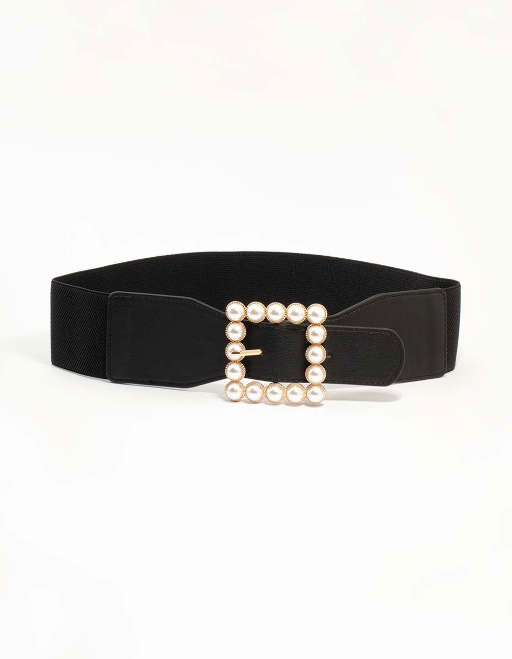 This beautiful stretch belt adds a classic and stylish touch to your outfit. It features black fabric with a pearl buckle at the centre, providing a comfortable stretch that enhances your overall look.