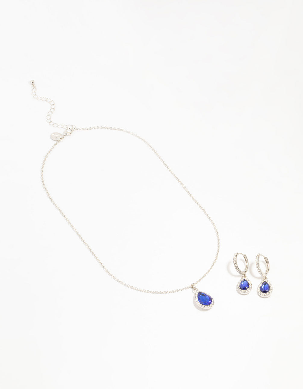 Silver Blue Diamante Halo Necklace & Huggie Earrings Set