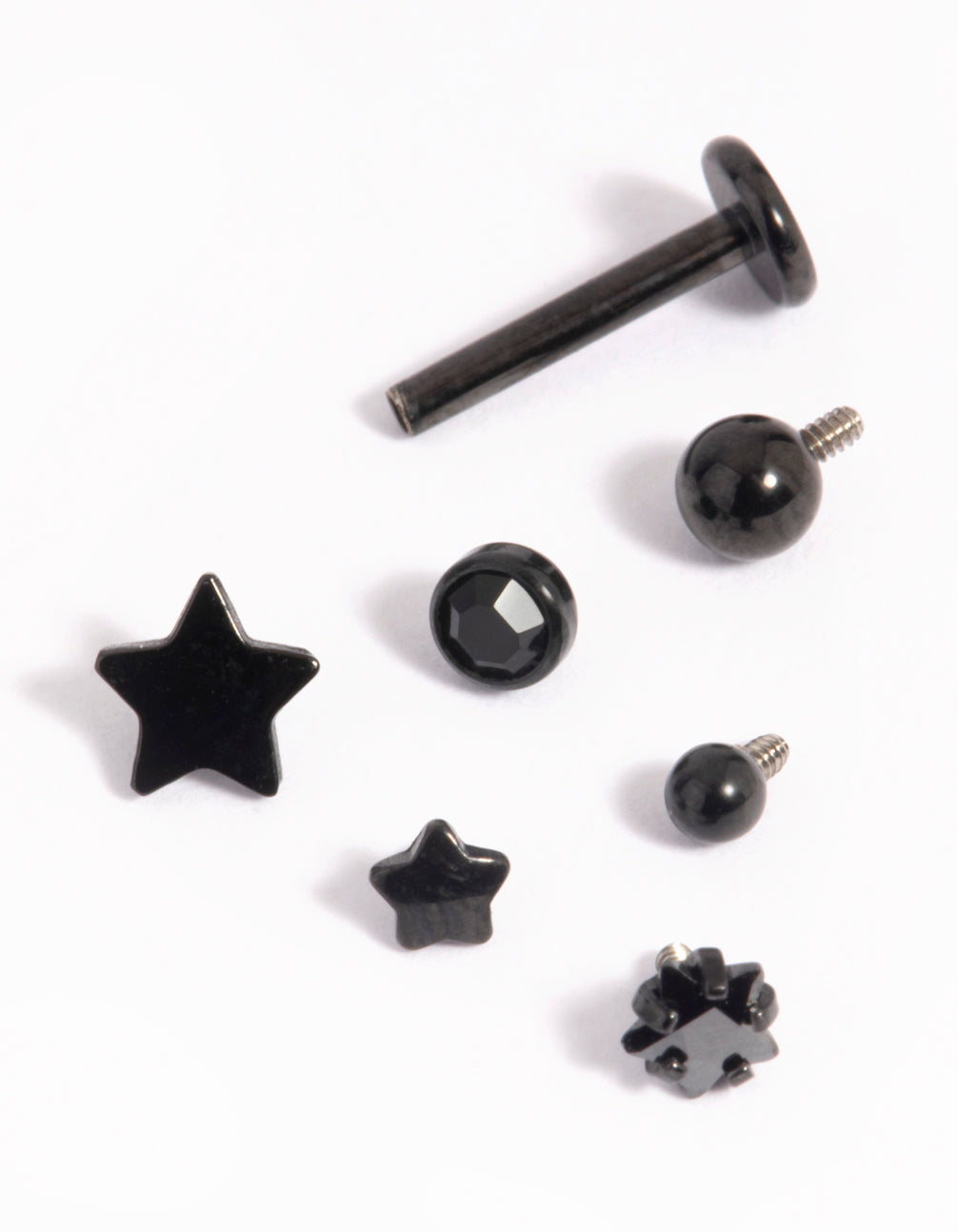 Matte Black Surgical Steel Single Flat Back Bar & Diamante Star Interchangeable Ends 6-Pack