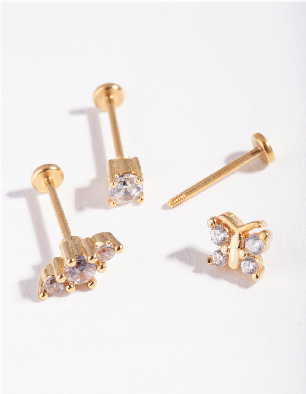 Elevate your ear stack with this flat back ear pack, featuring a variety of gold-toned butterfly designs. These earrings have surgical steel posts.