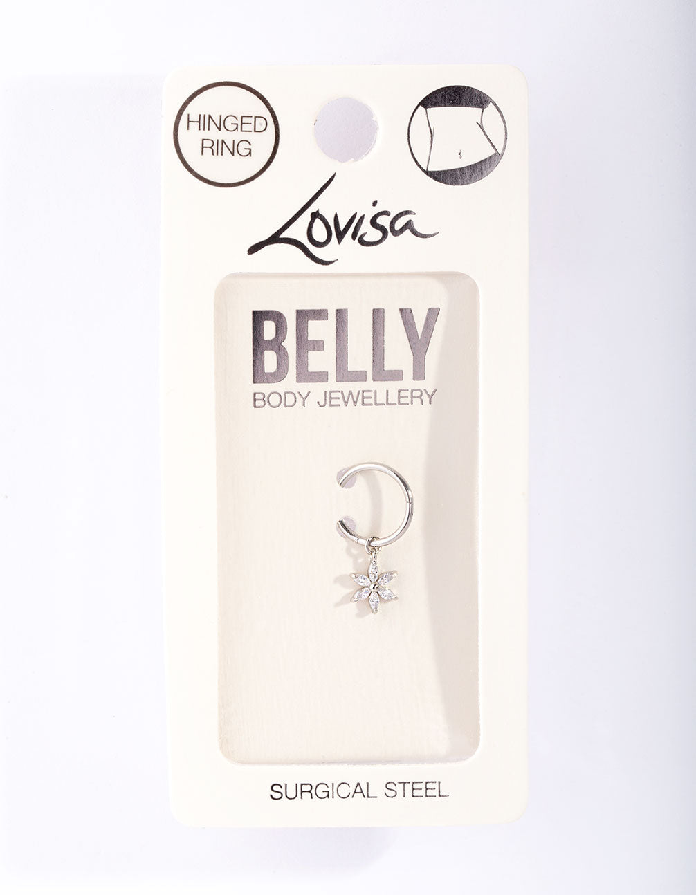 Belly bars and rings are a fun way to show off your style and add something different to your vacation or poolside outfits. This hinged belly ring comes with a silver setting and a floral cubic zirconia embellished design. It has a surgical steel post.
