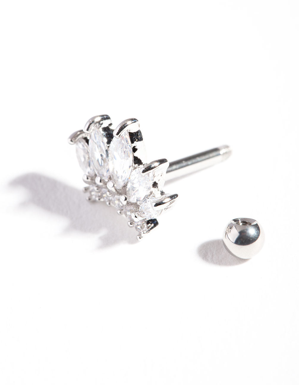 This silver-toned barbell earring features a cluster of sparkling cubic zirconia embellishments, making it the perfect finish to your stack. It has a surgical steel post.