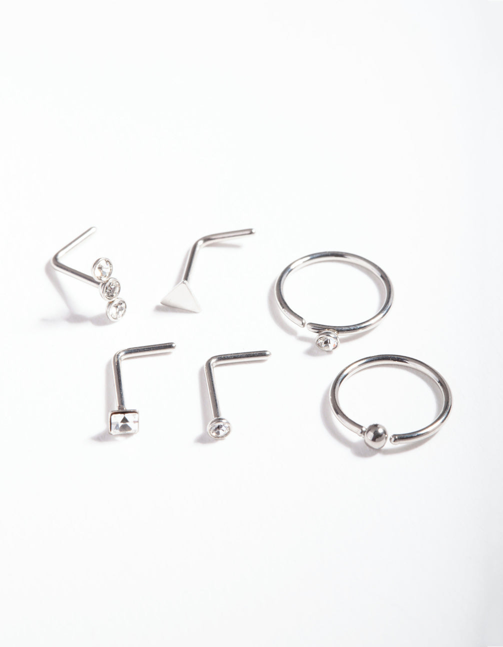 Lovisa body jewellery is made from surgical steel, making it the perfect option for everyday wear. This collection has been made with piercings in mind and features both trend-led and classic styles that you can swap out to suit any occasion. This pack comes with 6 geometric and diamante nose ring styles in a silver-toned setting. Mix and match your nose rings to coordinate with cubic zirconia accessories for a fashion-forward look!
