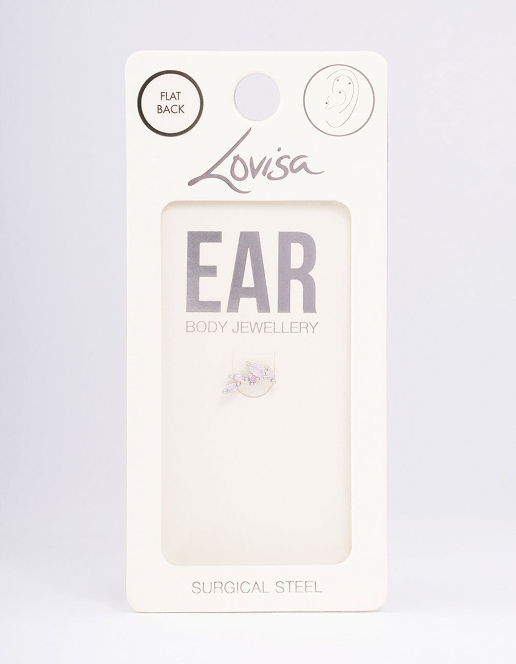 • This surgical steel flat back piercing features a lilac, marquise crystal design for an embellished finish. Style this flat back as a helix, cartilage or tragus piercing.