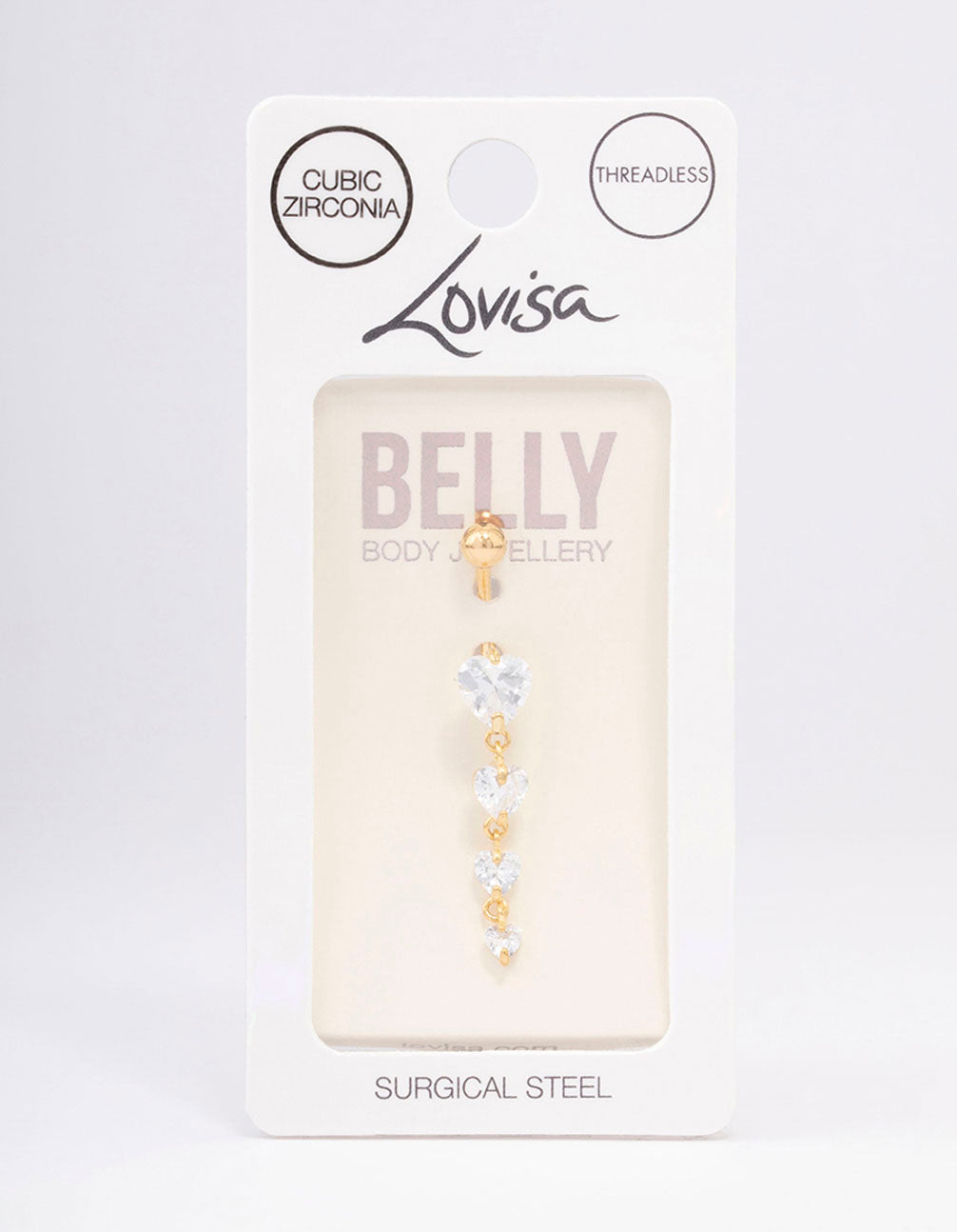 This belly bar features heart-shaped cubic zirconia crystals for a touch of playful shimmer. Made from surgical steel with gold plating, it's durable, hypoallergenic and shiny. Plus the threadless style makes it great for secure all day wear and easy to take out if needed.