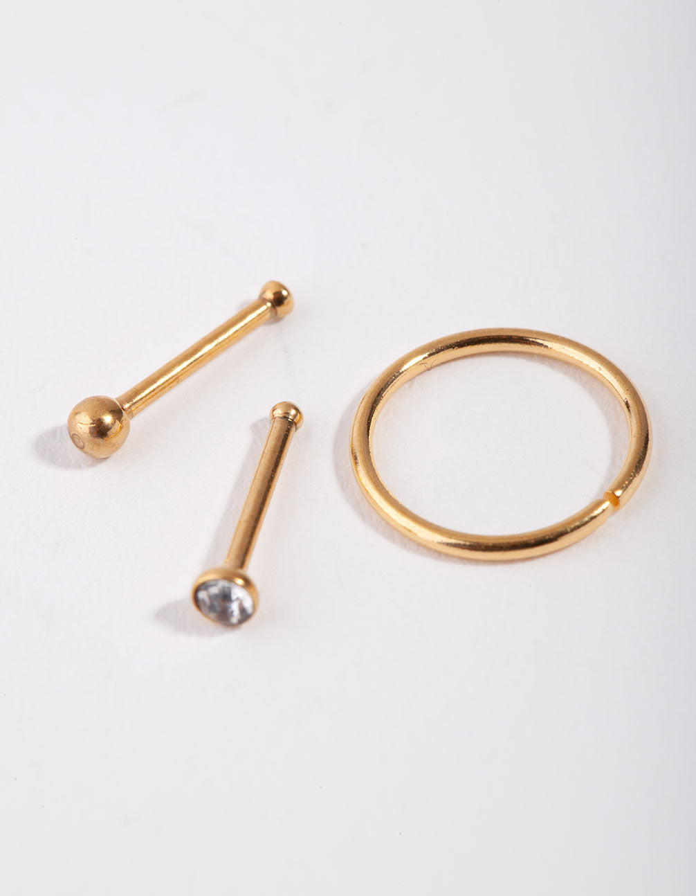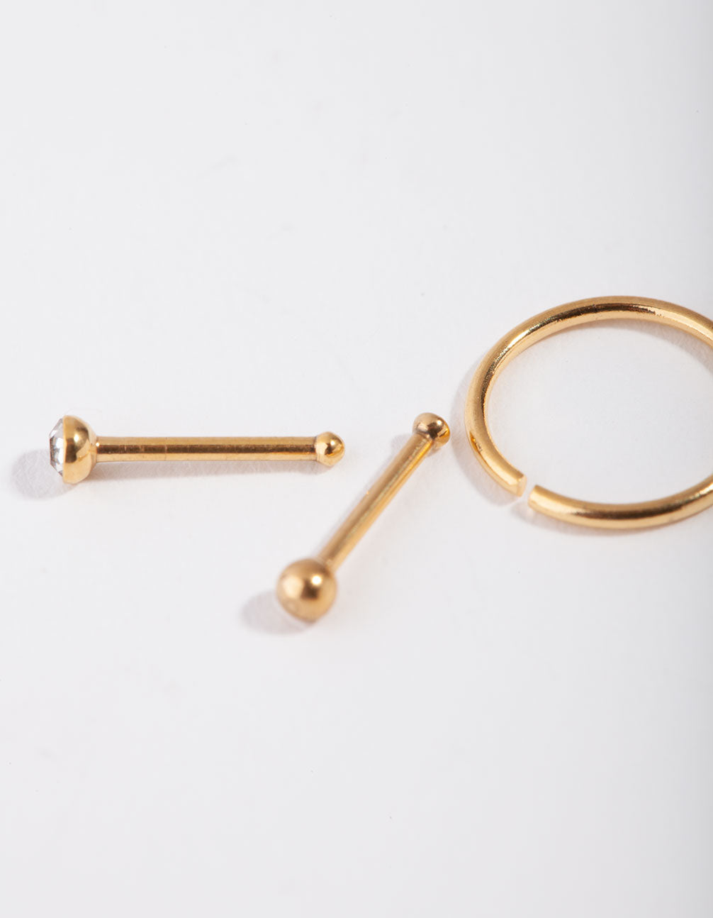 Stack it up with this curated body pack! This gold-toned pack features two nose studs and a hoop nose ring. It includes a micro diamante stud for extra sparkle.
