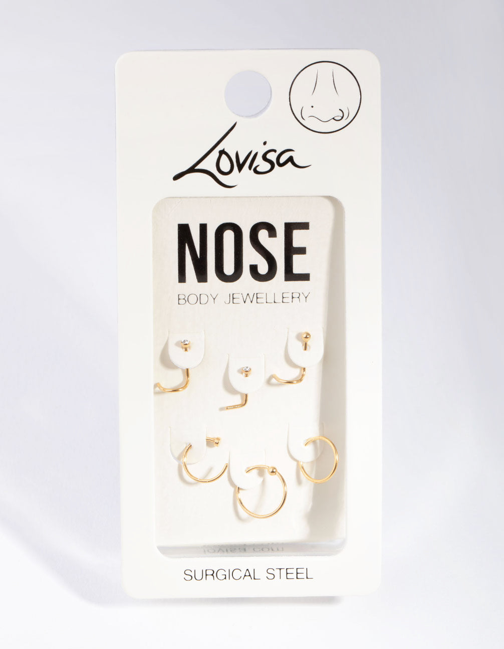 Round out your body jewellery collection with a nose piercing pack! This gold-toned set includes six nose rings and studs that boast diamante-embellishments. Lovisa body jewellery is made from surgical steel, so it's gentle on your skin and safe for daily use. These pieces have a gauge of 20 and are 0.8mm length.
