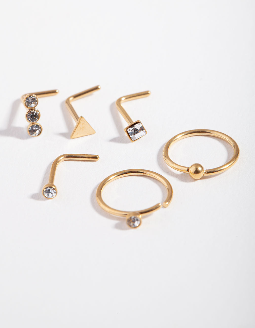 Lovisa body jewellery is made from surgical steel, which means it's gentle on your skin and perfect for daily wear. This gold-toned pack includes six nose rings that boast geometric designs and diamante embellishments. They have a gauge of 20 and are 0.8mm in length.