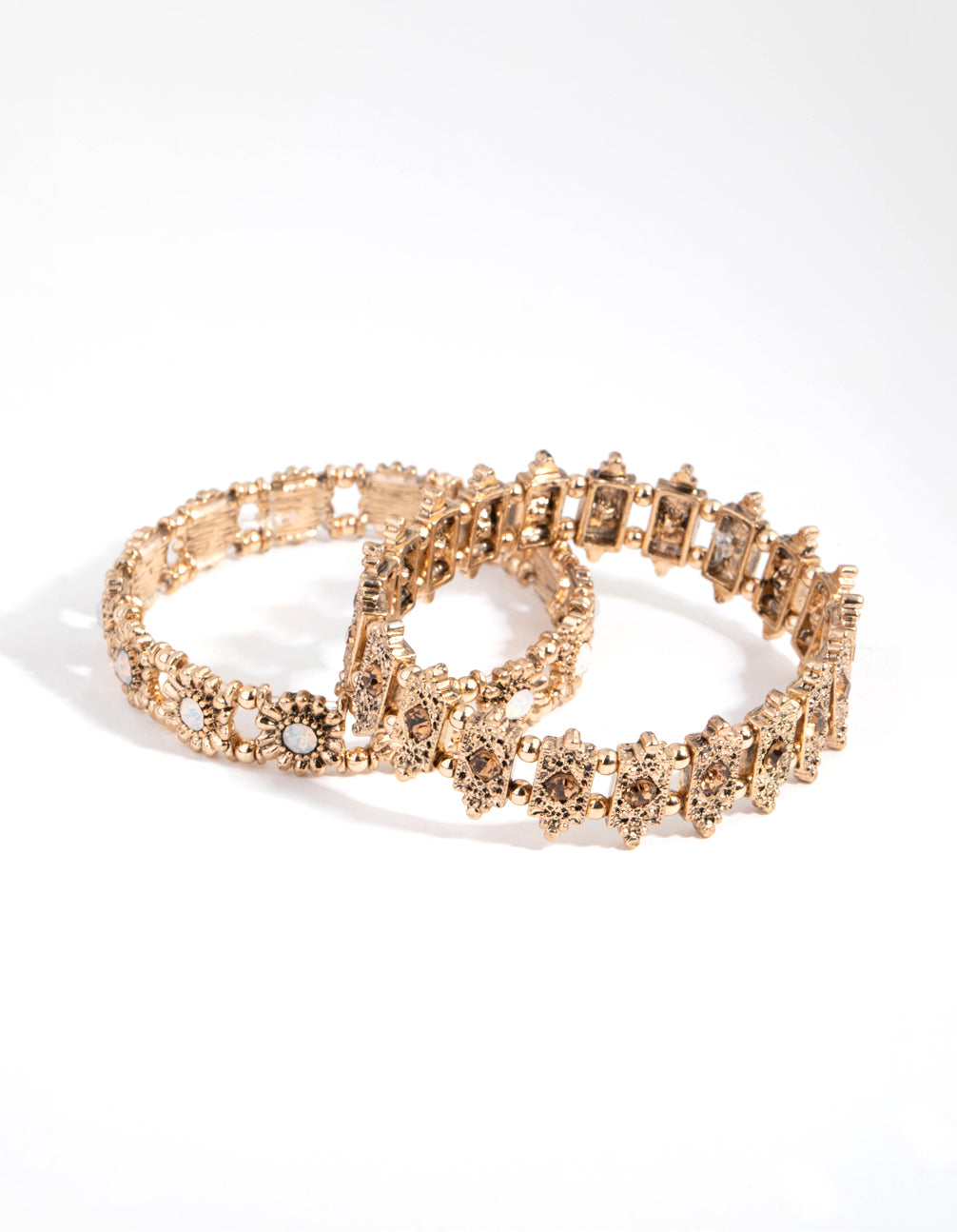 Elevate your ensemble with this funky bracelet pack! It includes two gold-toned bracelets, with an antique finish for a vintage vibe. Each bracelet features crystal-like stones at their centre in either amber or milky tones. Stack them together and pair them with other funky jewellery for a boho-inspired look.