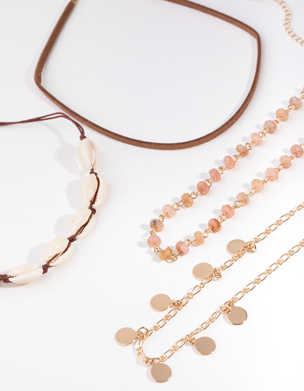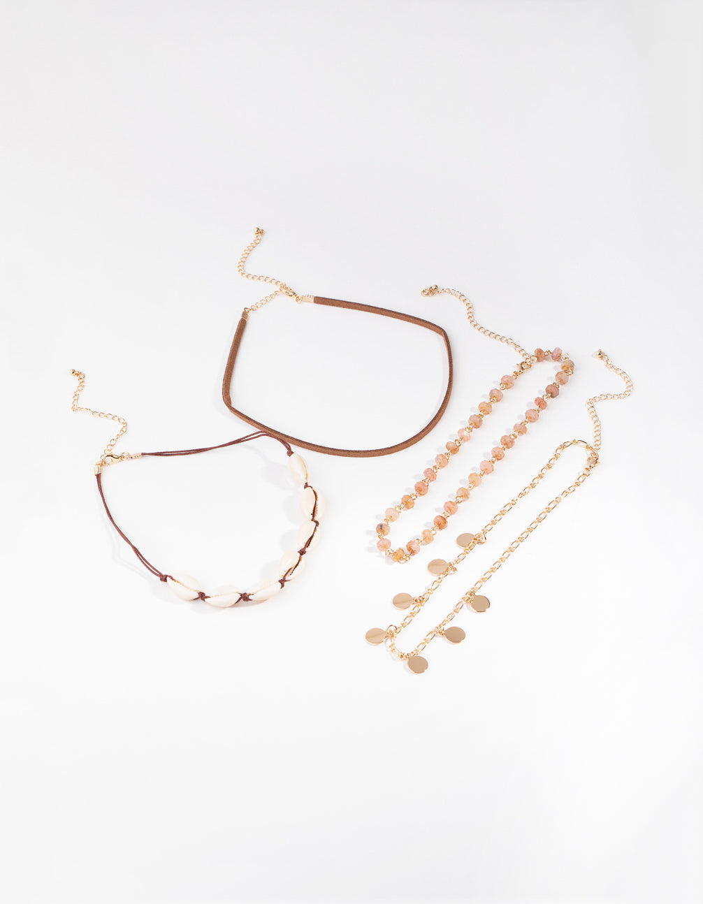 You'll be beach ready when you're wearing these necklaces. This necklace pack includes four chokers in brown and gold-toned shades, with shell and bead embellishments. Wear with your favourite poolside look! <5>