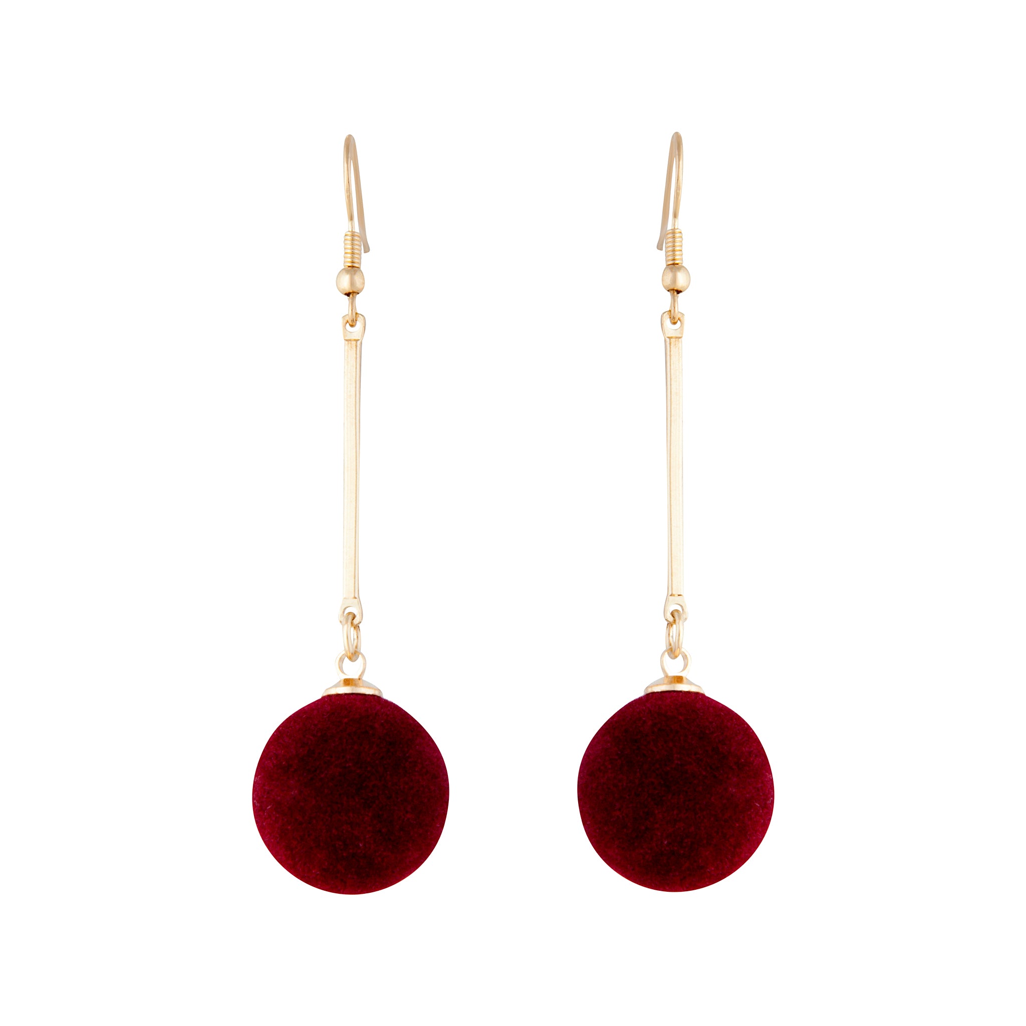 A simple gold toned bar drops down into a flocked burgundy bead.