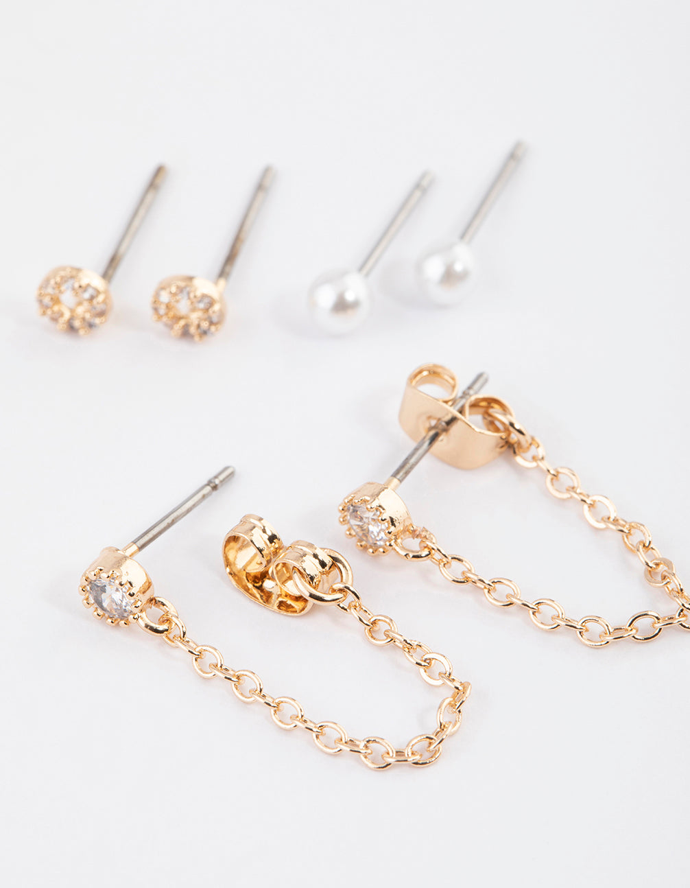 - This simple three pack contains three sets of gold-toned earrings, embellished with diamantes, pearls and chain detailing for a timeless look.