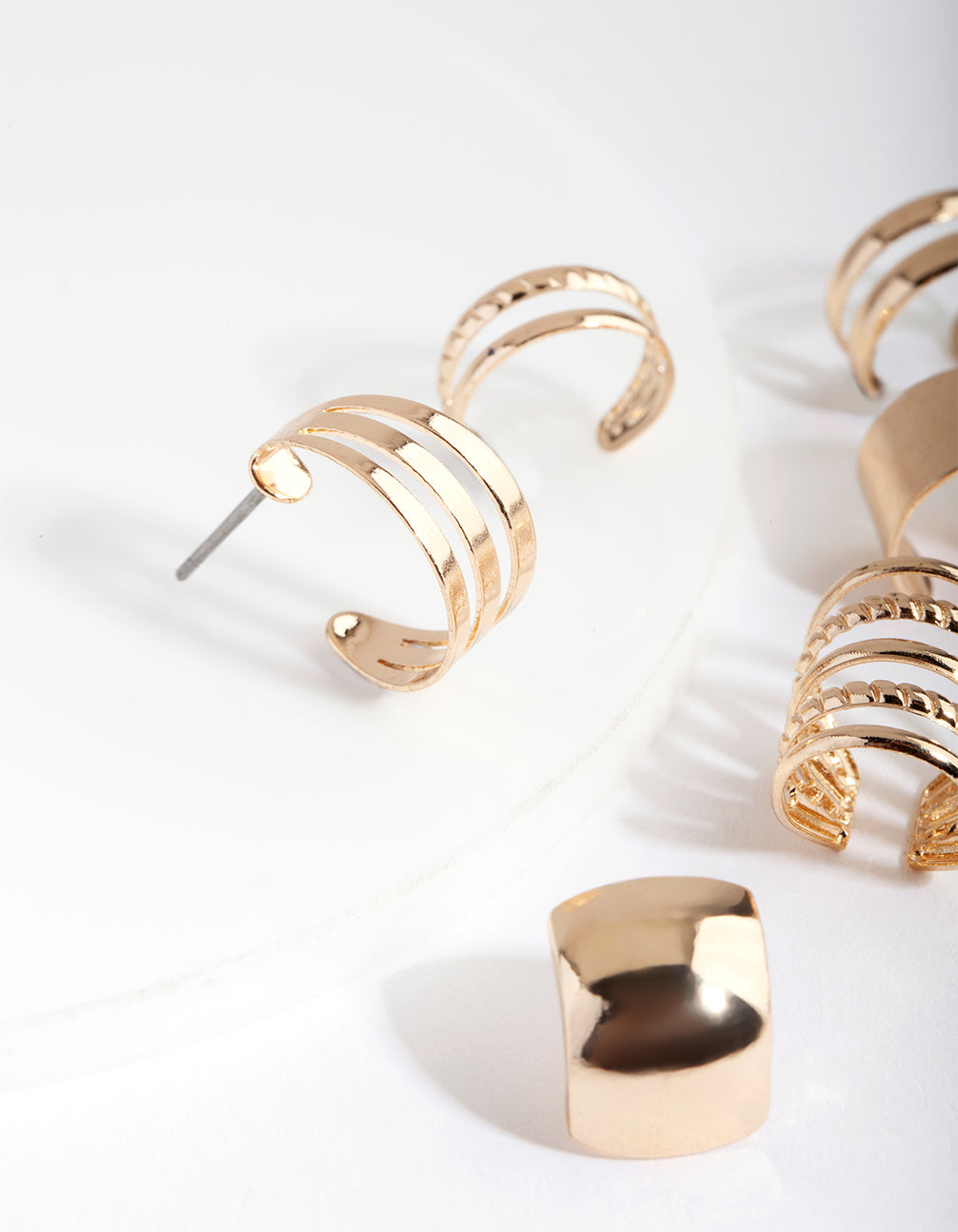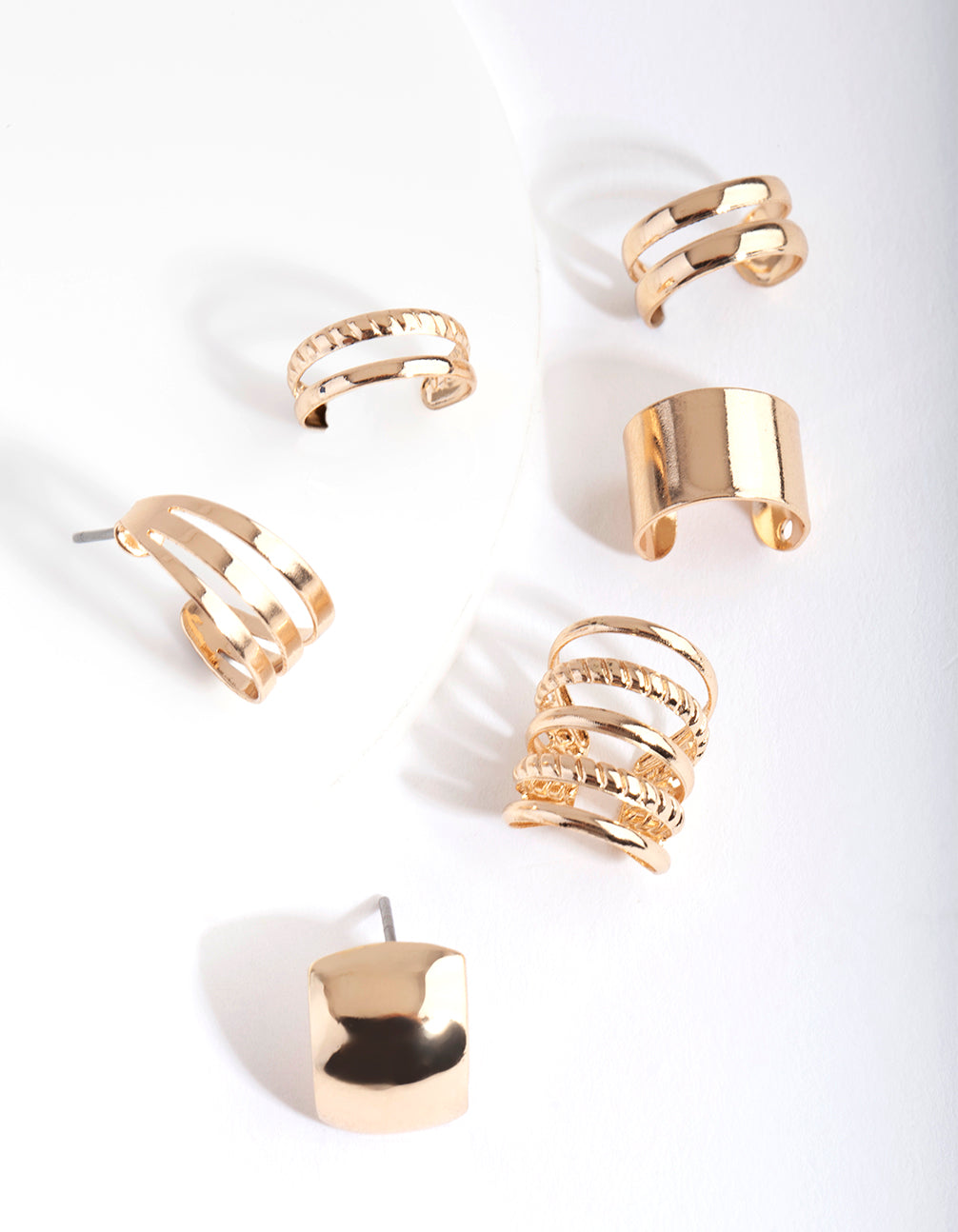 Stack up the style with a curated ear pack! This pack features a variety of earrings and ear cuffs that you can mix and match to suit your piercings. It features a gold-toned setting with a multi-layered texture design.