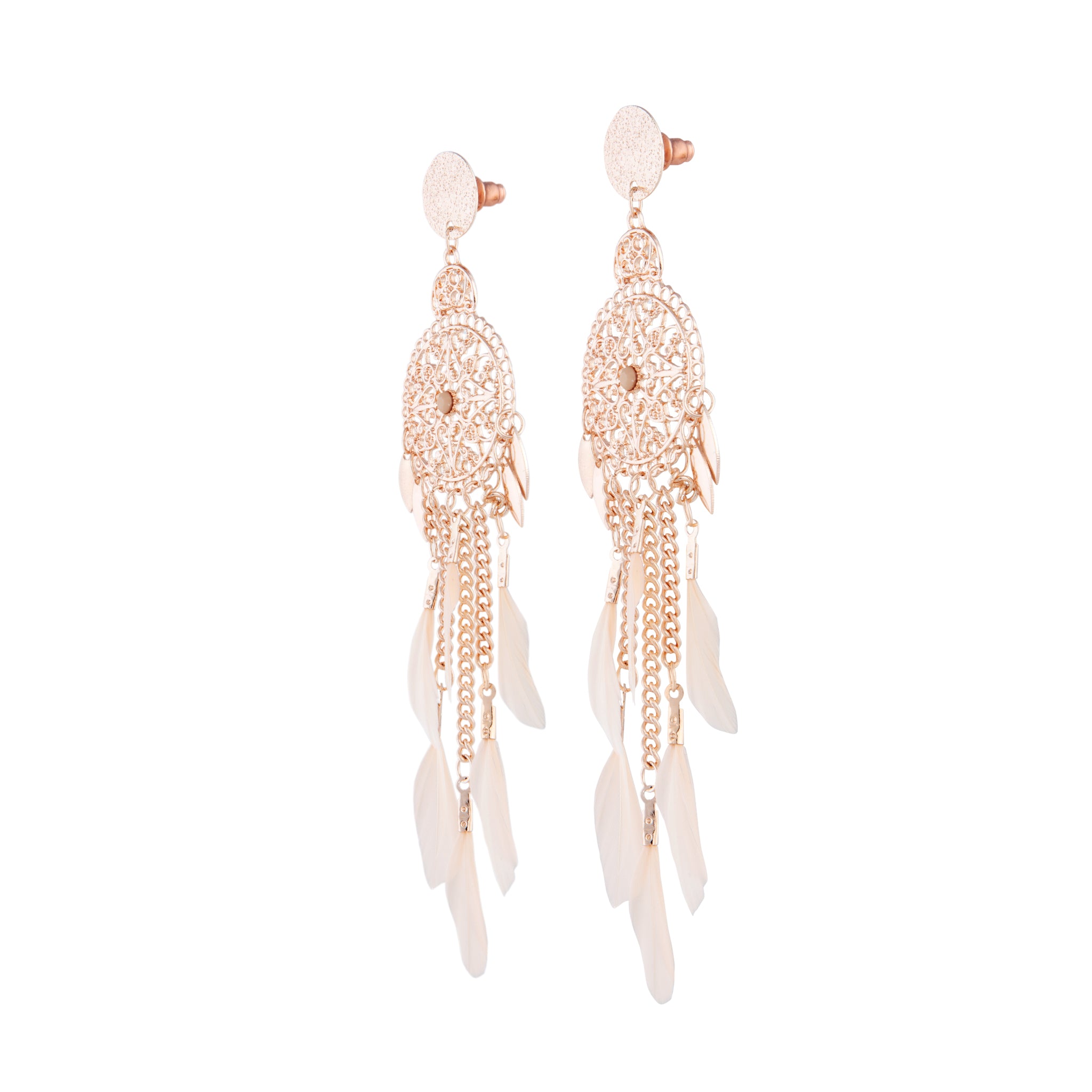 Create a free-spirited look with stunning feather accessories. These rose gold toned earrings feature a dreamcatcher motif with pink feathers. Style with semi-precious gems for a dreamy aesthetic.