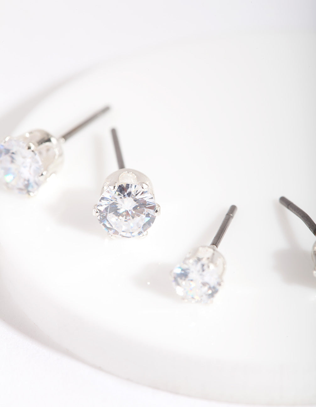 This silver-tone earring two pack boasts round stud designs with centered cubic zirconia gems.