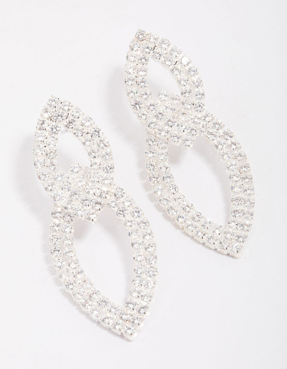 - These silver-toned drop earrings feature a double-layered effect, embellished with delicate crystals, perfect for styling with an evening look.