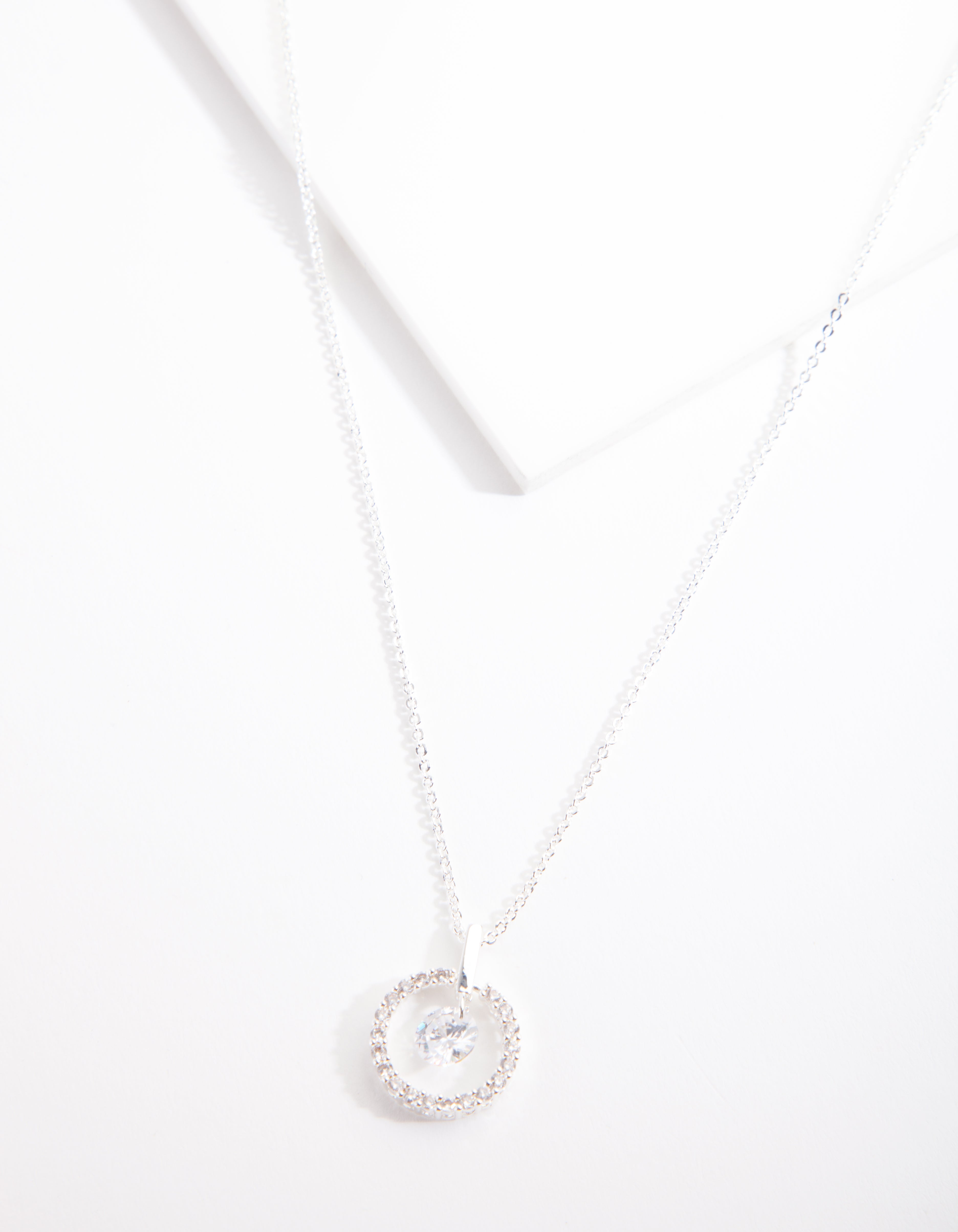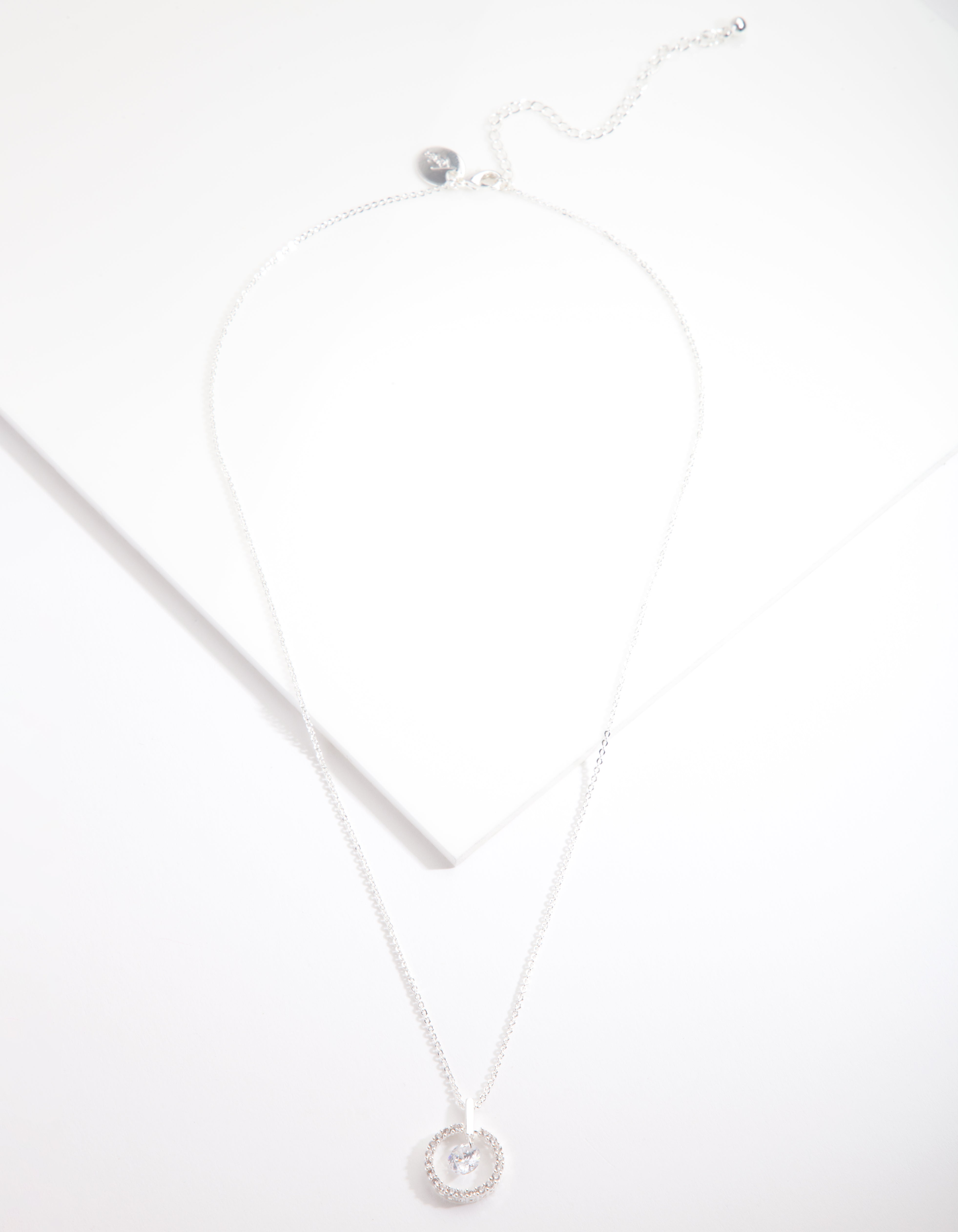 Shine bright with cubic zirconias and add some glamour to your look. This silver-tone necklace features a cubic zirconia diamante centered in the middle of an embellished open circle pendant.