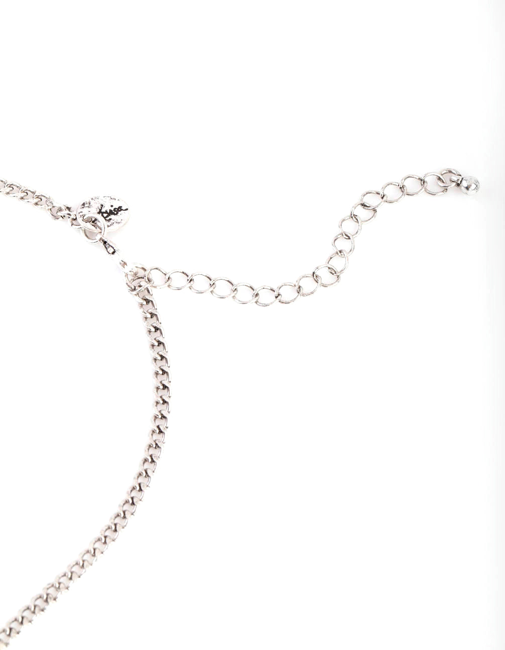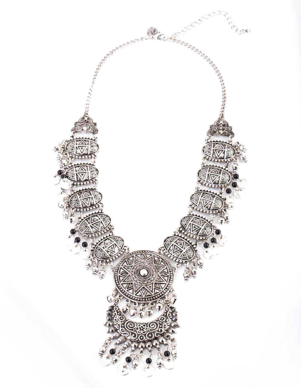 A bohemian style silver-toned drop necklace which features bead detailing and bohemian inspired etching.