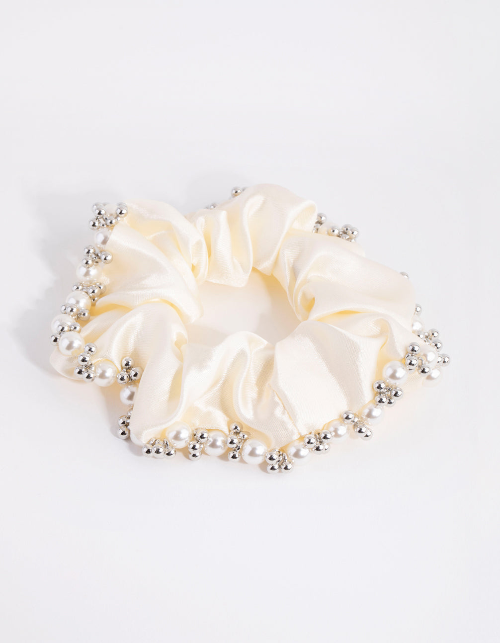 Up your hair game with this chic scrunchie! It's silky soft, and boats a lovely cream colour. The edge is studded with beads and faux pearls, so glam! Wear it to add the finishing touch to your bun or ponytail.