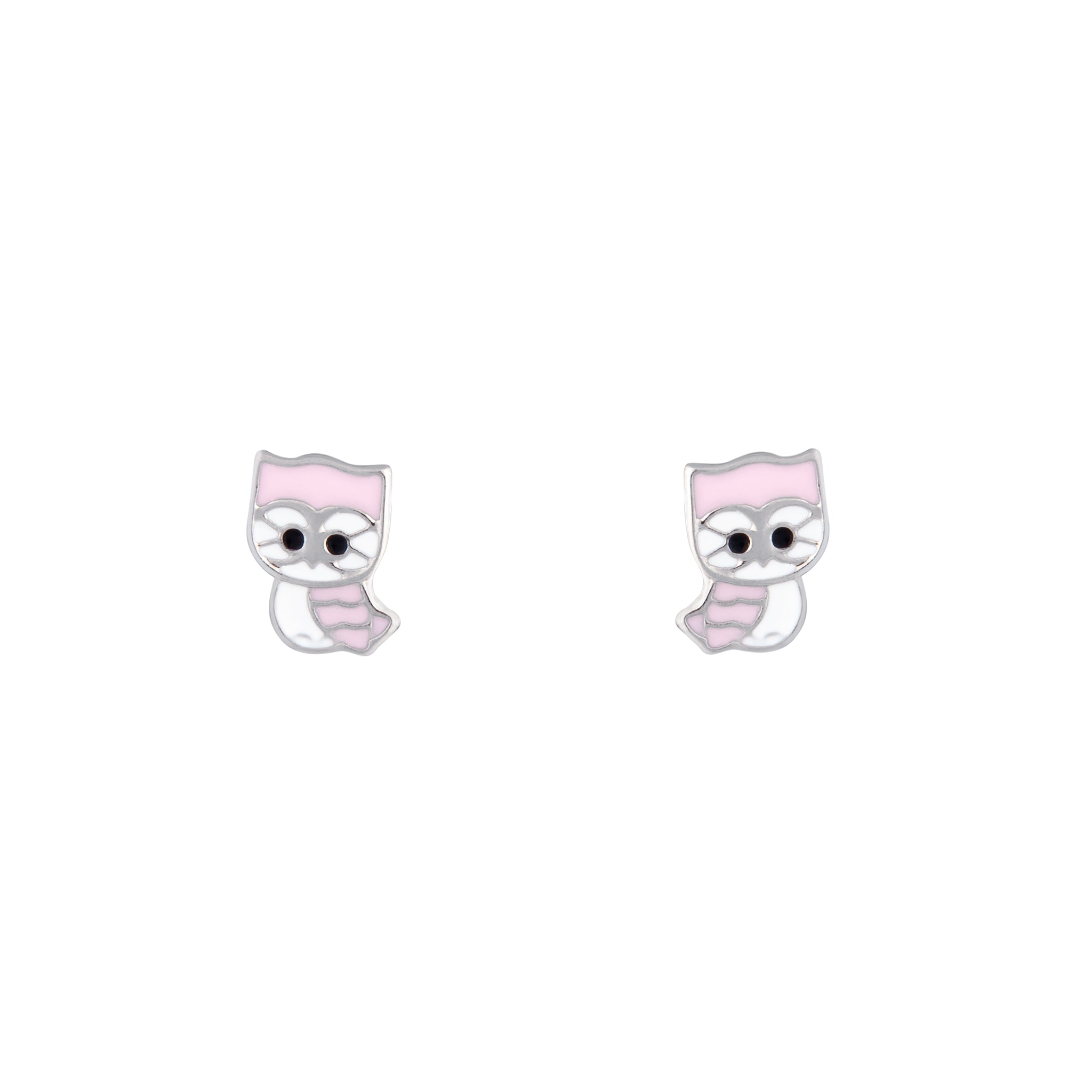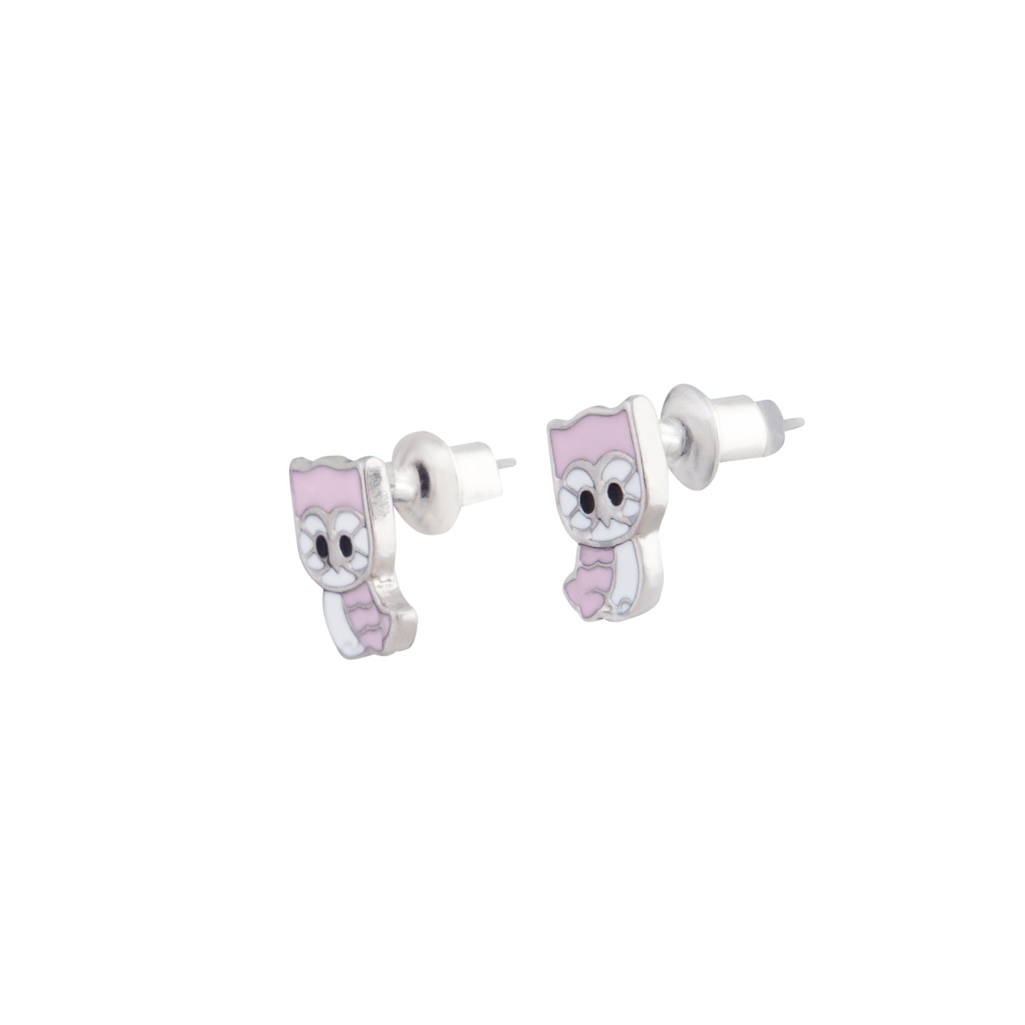 A pair of pink and white owl studs.
