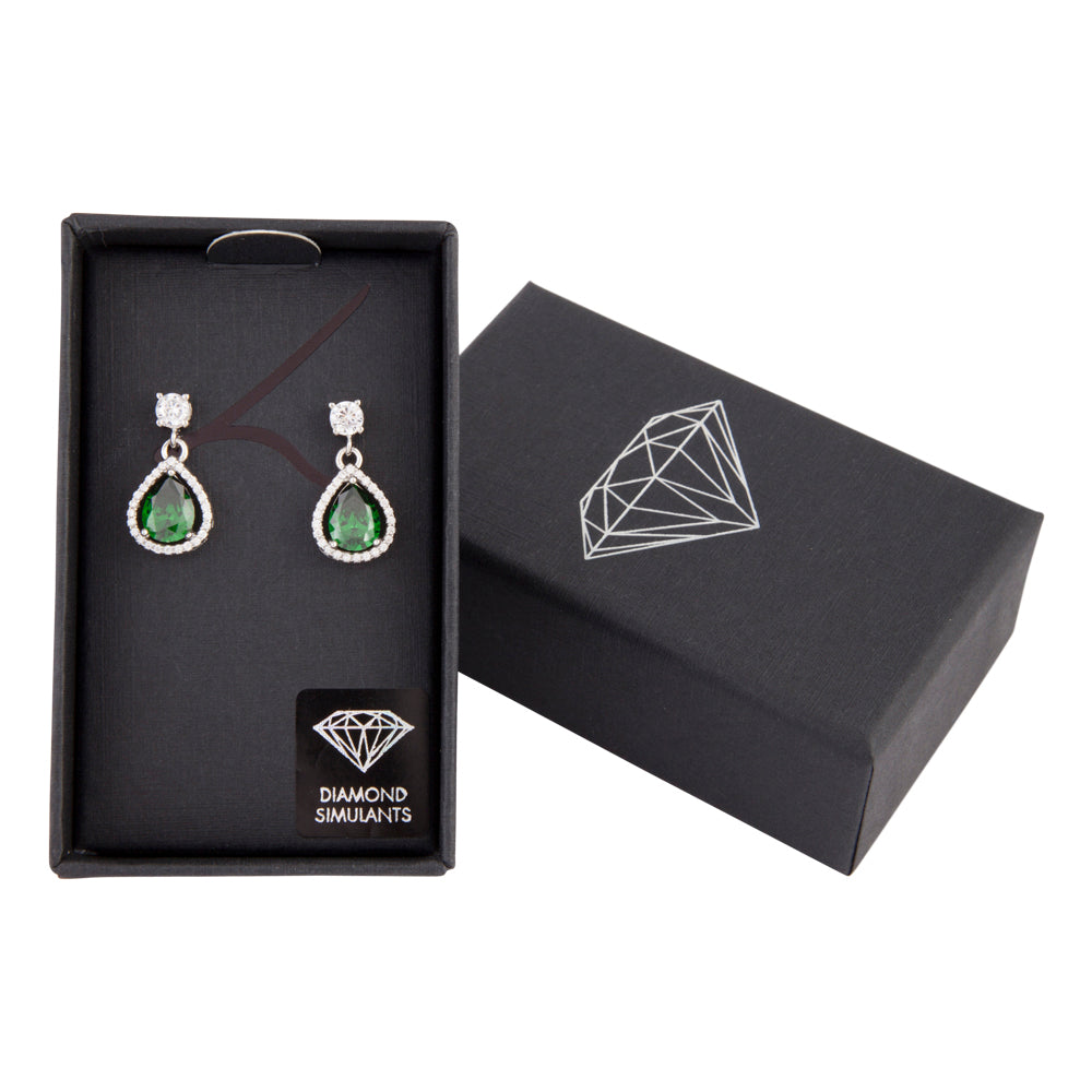 These earrings are made with diamond simulants, which are cut to be indistinguishable to the naked eye from a true diamond. They feature emerald-green embellishments. Pair them with an evening outfit for a luxurious look.