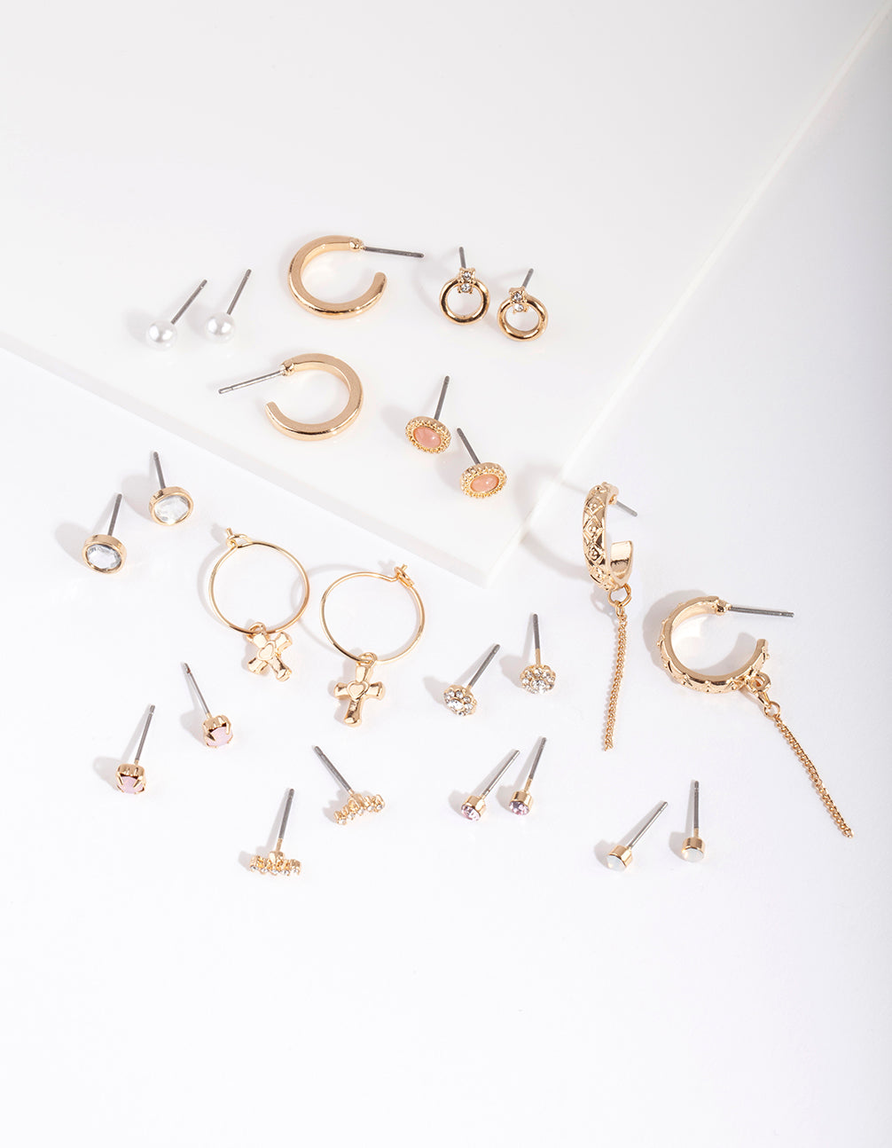 Can't decide on one? This range is perfect for those who have multiple piercings and want to achieve a curated fashion forward look! This earring pack boasts a variety of diamante hoop designs in a gold-tone.