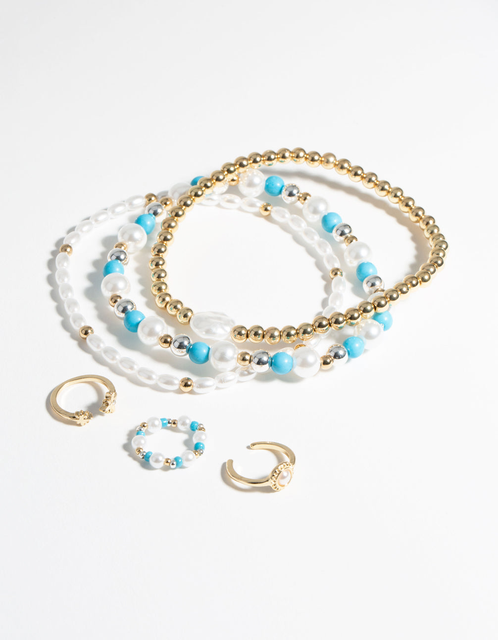 Pretty in Pearls! This gold-toned stretch bracelet and adjustable ring set features plastic round beads of faux pearl & turquoise. Put this set on with ease and mix and match with other bracelets and bangles in your collection.