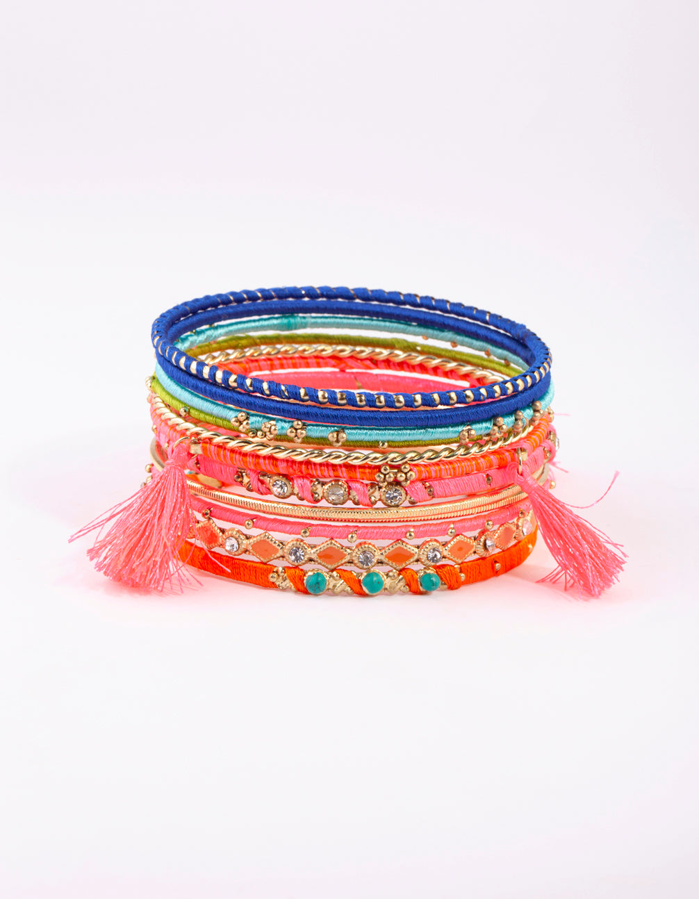 Get the good vibes started with this funky bangle pack! It features 11 bangles in a mix of vivid colours and gold tones. Stack them all together for maximum impact!