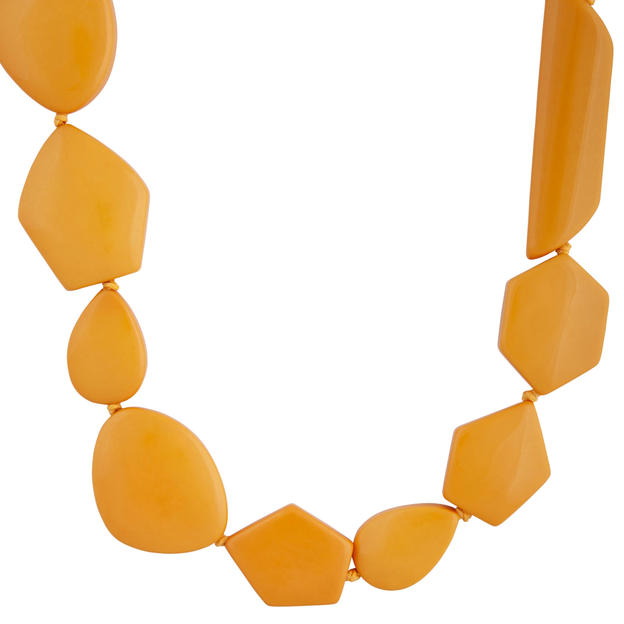 Bold accessories like chunky and vibrant necklaces can inspire an entire outfit! This long necklace comes with a yellow acrylic geometric design. Style with neutrals to allow the warm tone to pop and stand out!