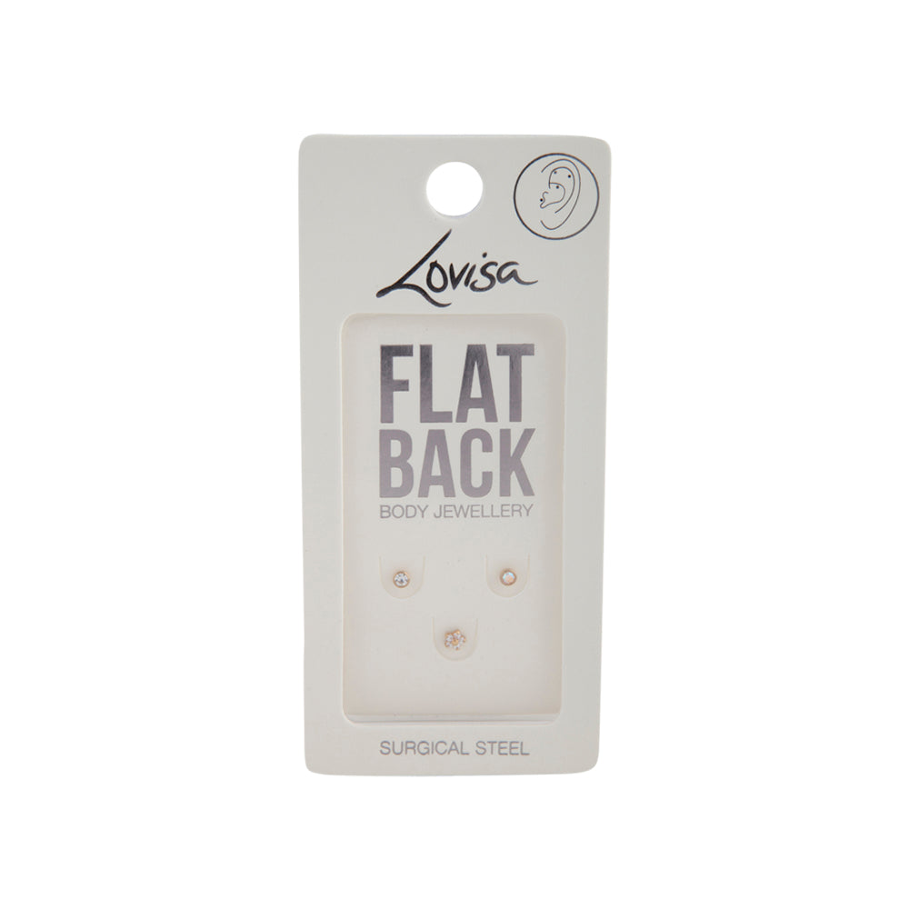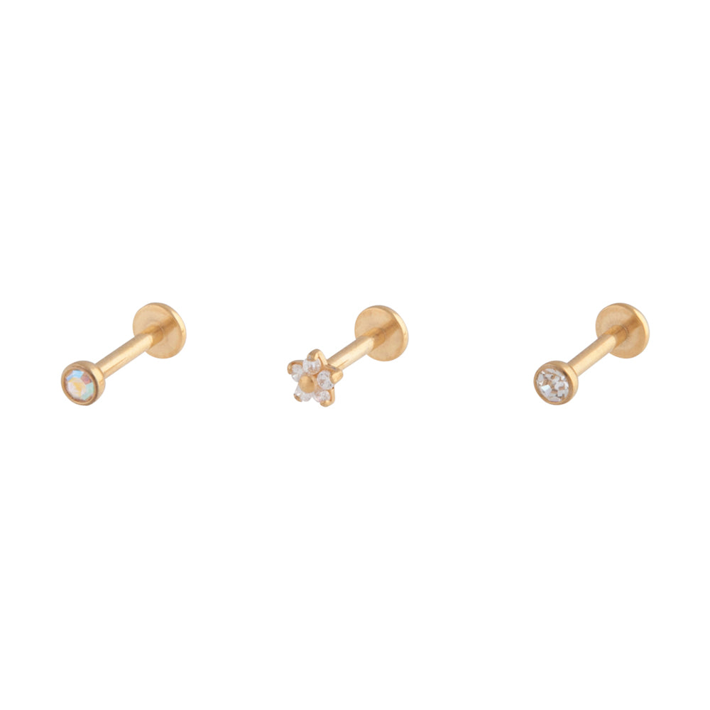 If you love piercings, the surgical steel body jewellery range from Lovisa is perfect for you. Pick up one of these reliable and timeless styles and curate your ear stack with Lovisa’s collection of clickers, flat backs, barbells and more. This trio of flat back earrings comes in a gold tone with flower and diamante designs. Our body jewellery is made from a surgical steel, making it perfect for daily wear. Check out our cubic zirconia range for accessories to match!