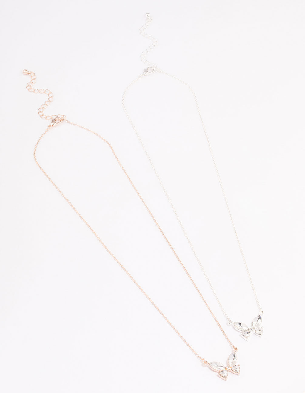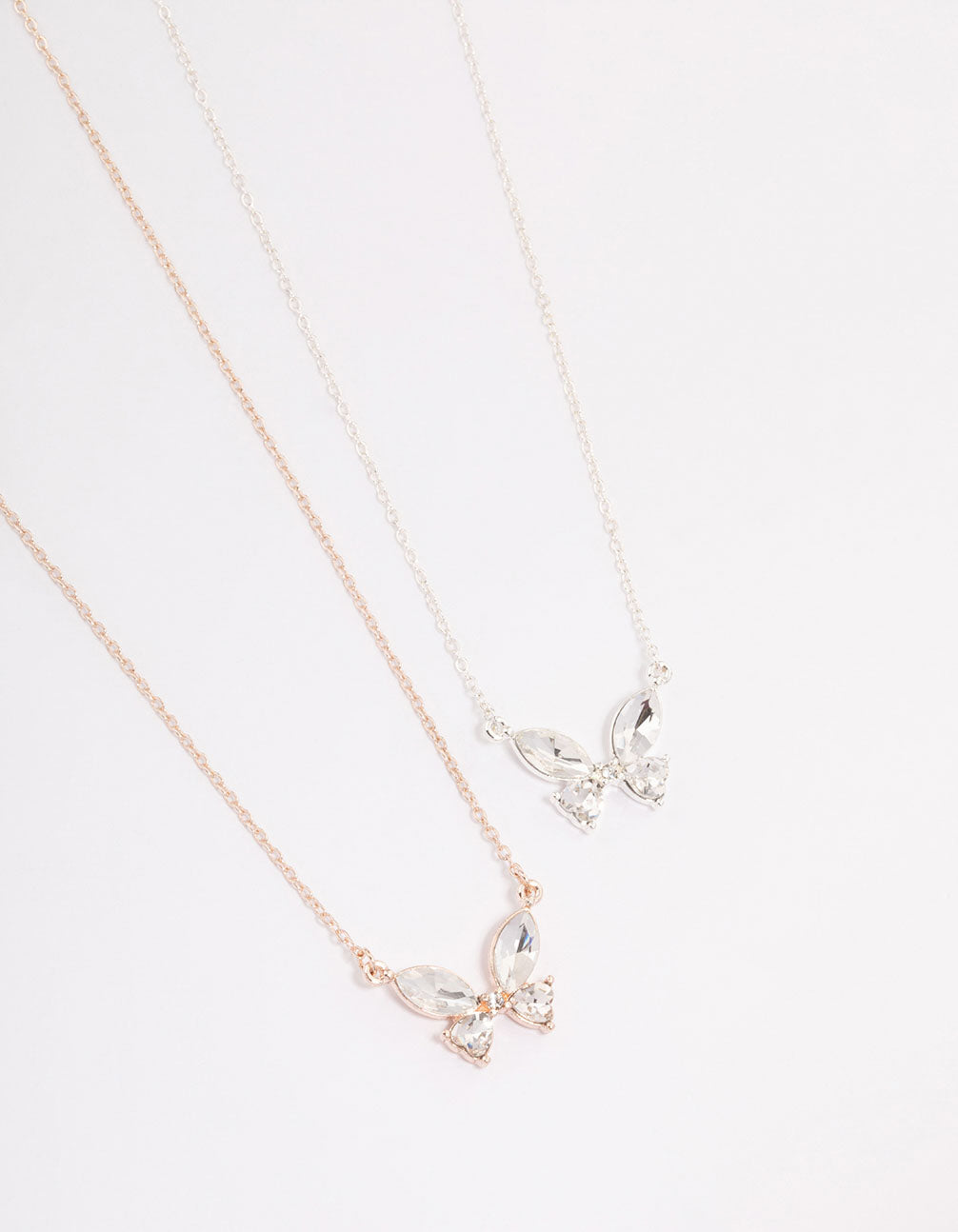 This exquisite pack includes two stunning necklaces featuring graceful butterfly motifs adorned with sparkling diamante details.