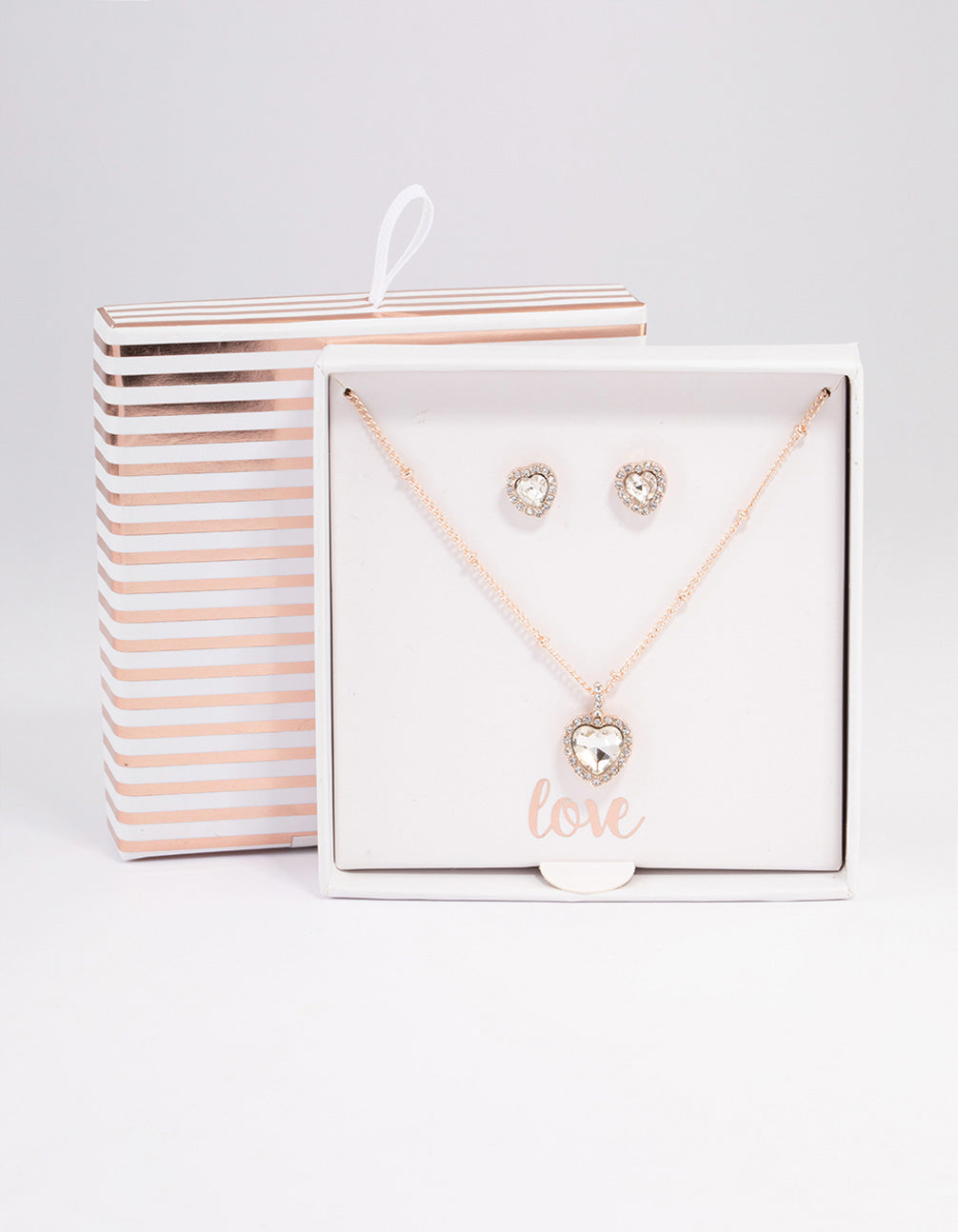 Rose Gold Heart Halo Necklace & Stud Earrings Set