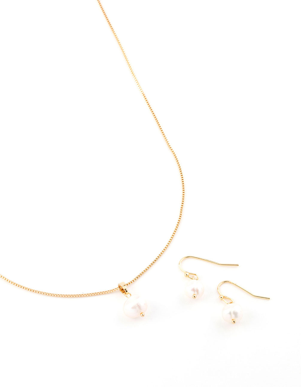 This gift box contains a simple gold plated jewellery set adorned with simple freshwater pearls for an elevated appearance.