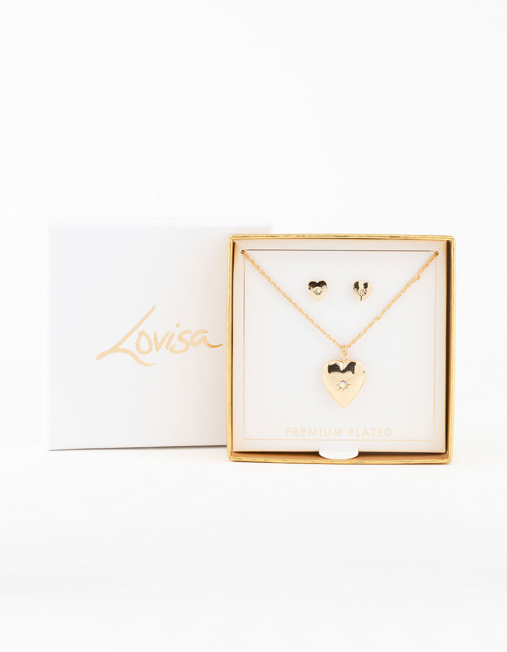 This gift box contains a simple gold plated jewellery set with an intricate heart-shaped locket for a timeless finish.