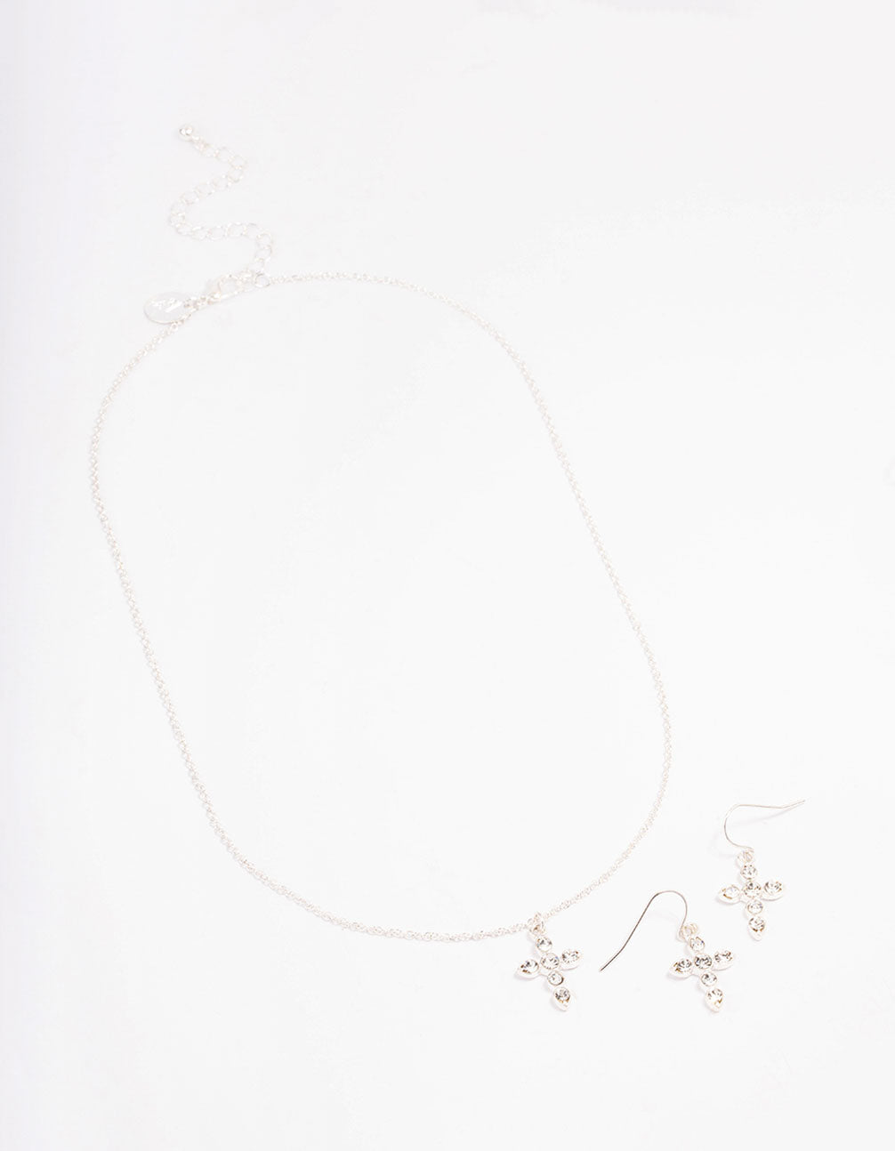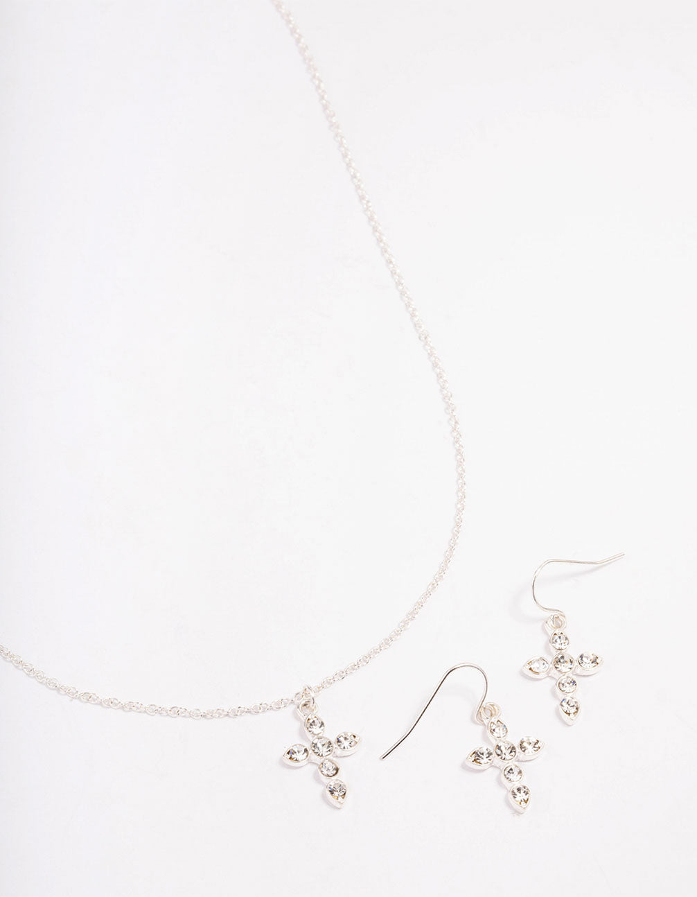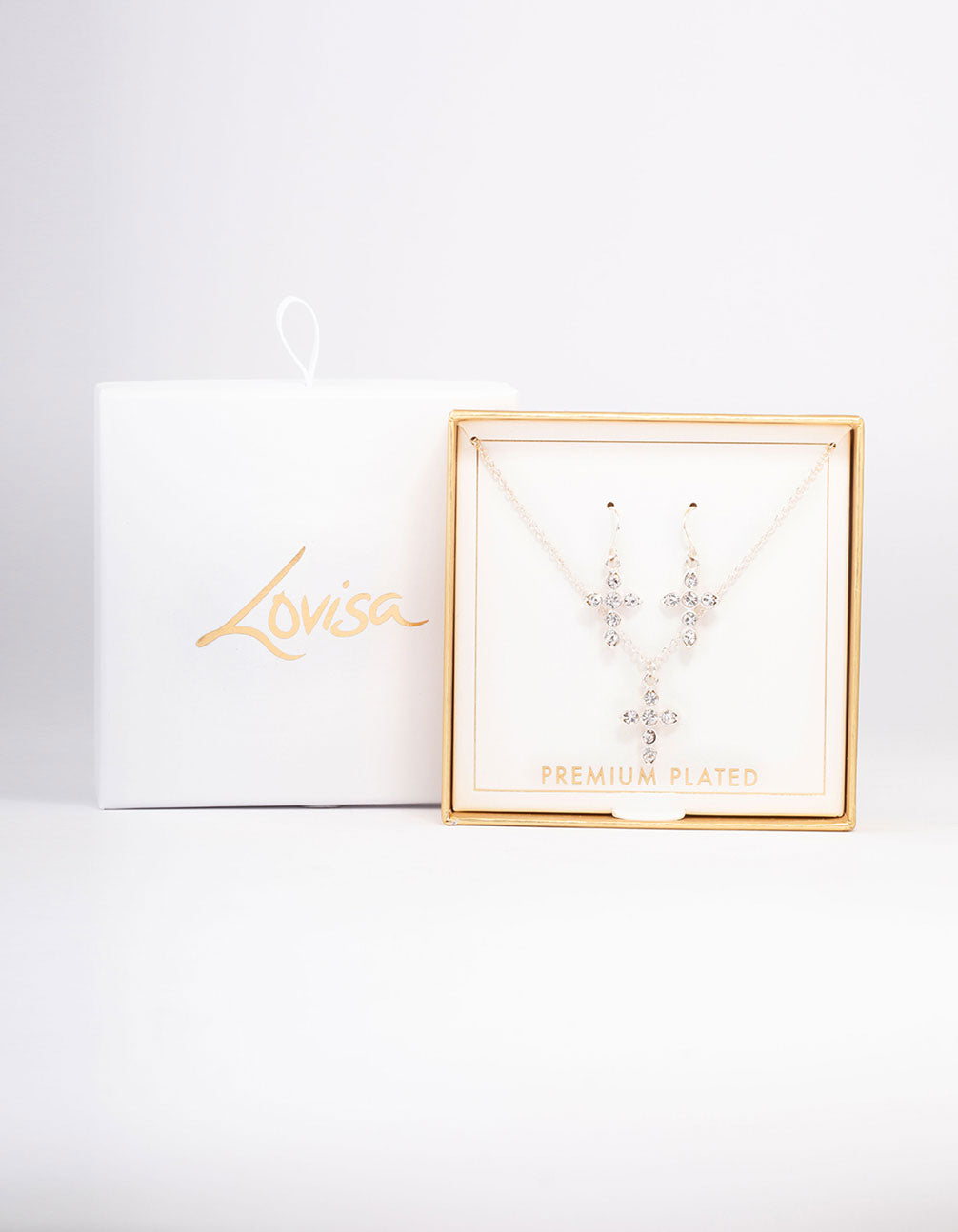 This gift box contains a simple jewellery set, plated with real silver. This set contains a pair of cross drop earrings and matching pendant necklace.
