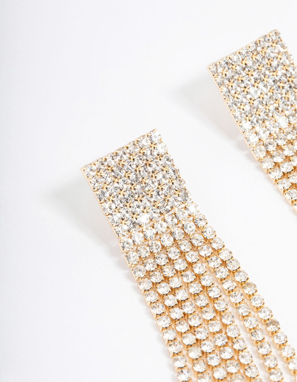 - These Gold Square Cupchain Drop Earrings feature a chandelier-inspired design, showcasing a waterfall of diamantes. The perfect addition to an Old Hollywood-inspired look.