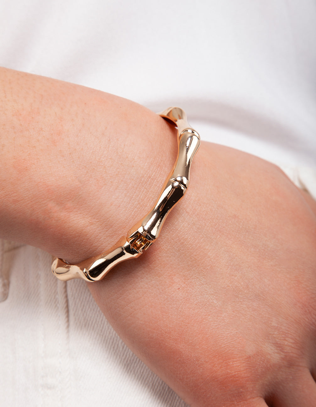 This essential piece is a go-to for those needing timeless jewels to round-out their collection. This bracelet features a gold-tone metal in a bamboo design with a clamp fastening.