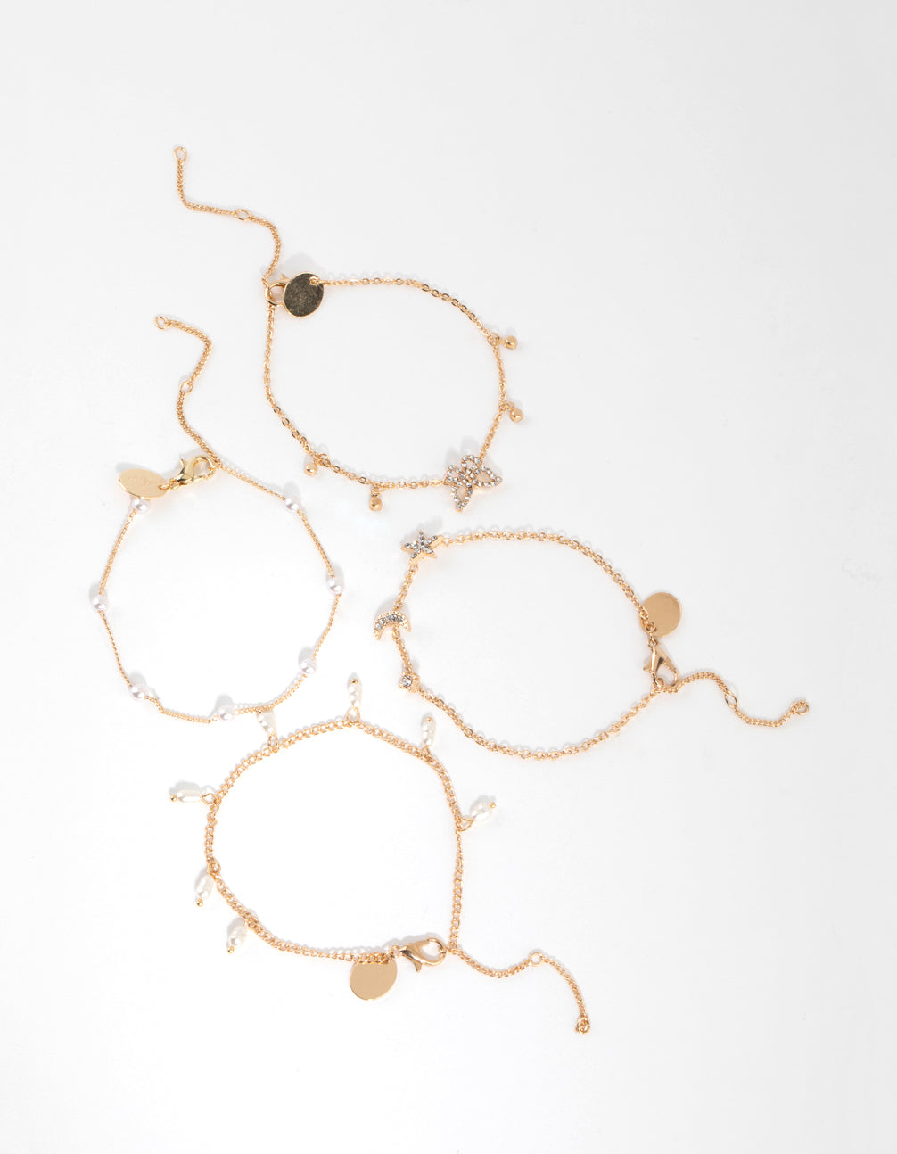 This bracelet and anklet set includes four fine chains in a gold tone. Each chain boasts a different design. Motifs includes butterflies, moons and stars and pieces have diamante and faux pearl embellishments. Stack them together for maximum impact.