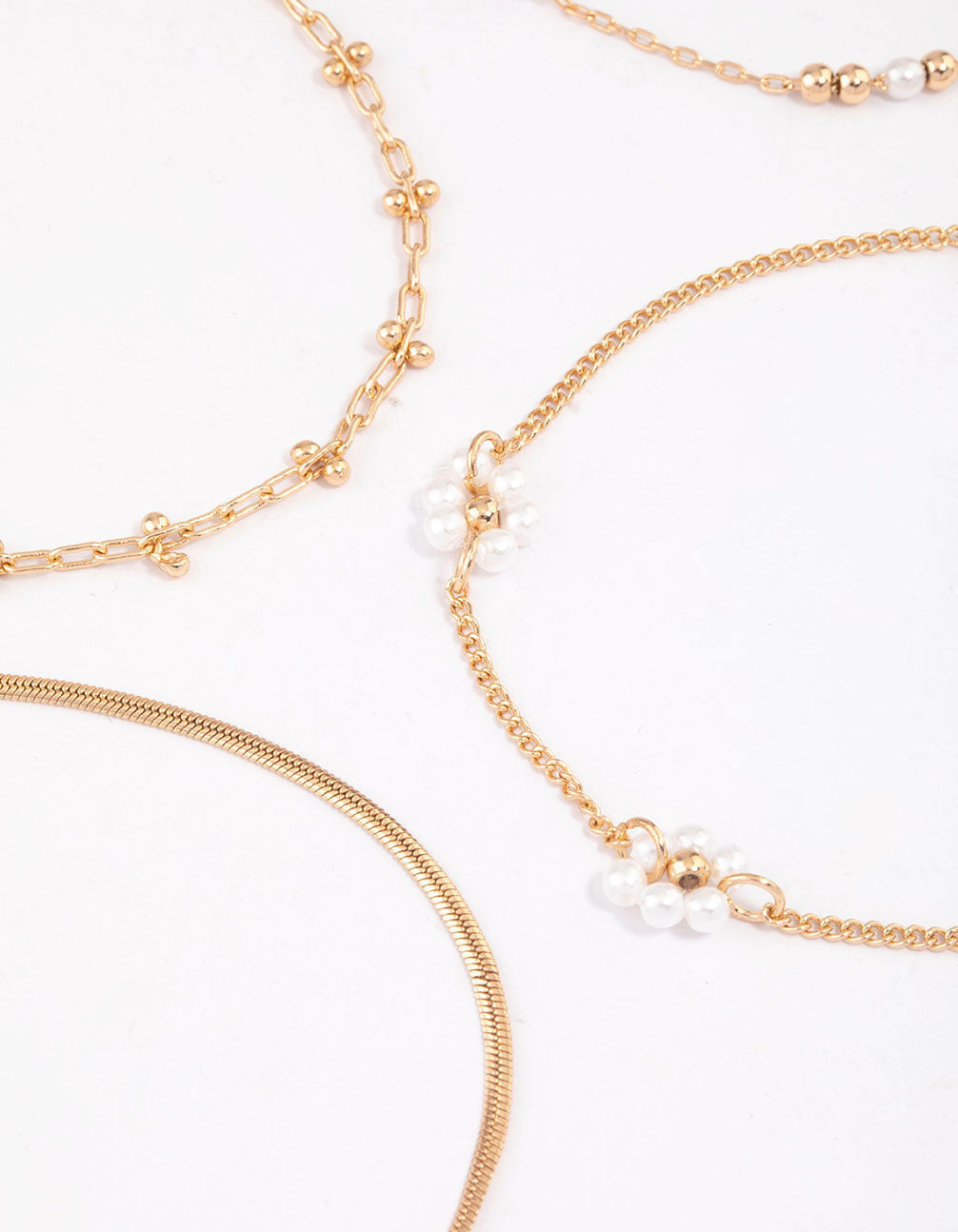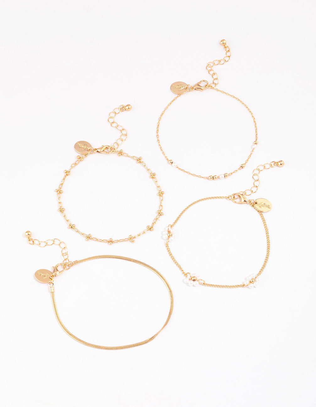 Embellish your look with this multi-pack of versatile bracelets and anklets. Designed with a gorgeous gold setting and pearly flower adornments, this four pack is perfect for layering your look.